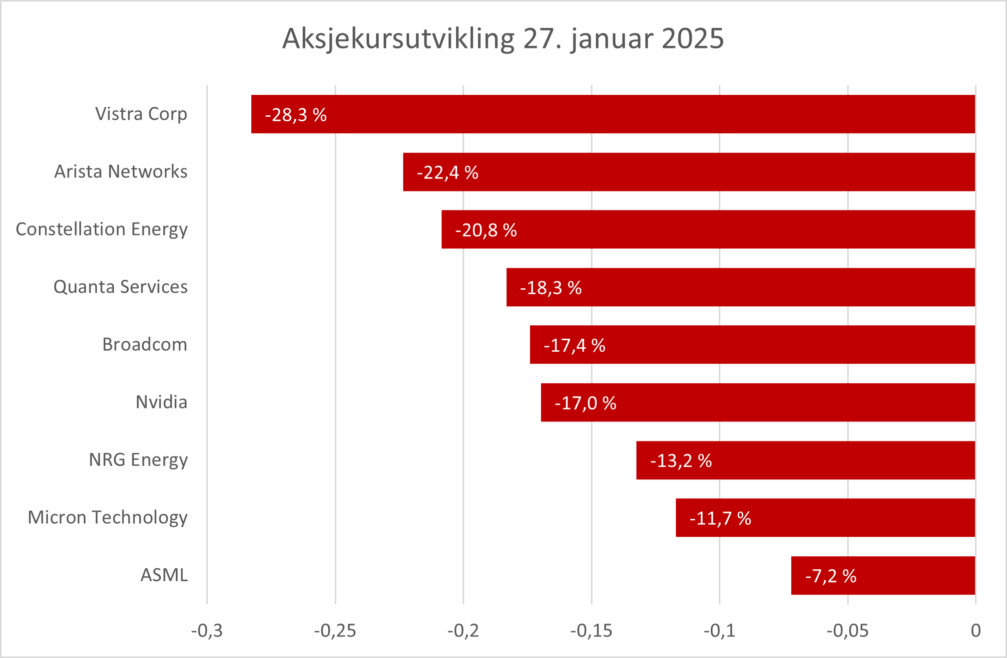 Også andre tech-selskaper, slik som Broadcom, Micron Technology og ASML falt på nyheten om den nye språkmodellen. I tillegg falt selskaper knyttet til energiproduksjon, datasentre og teknologi-infrastruktur, slik som Vistra, Constellation, NRG Energy, Arista Networks og Quanta Services.