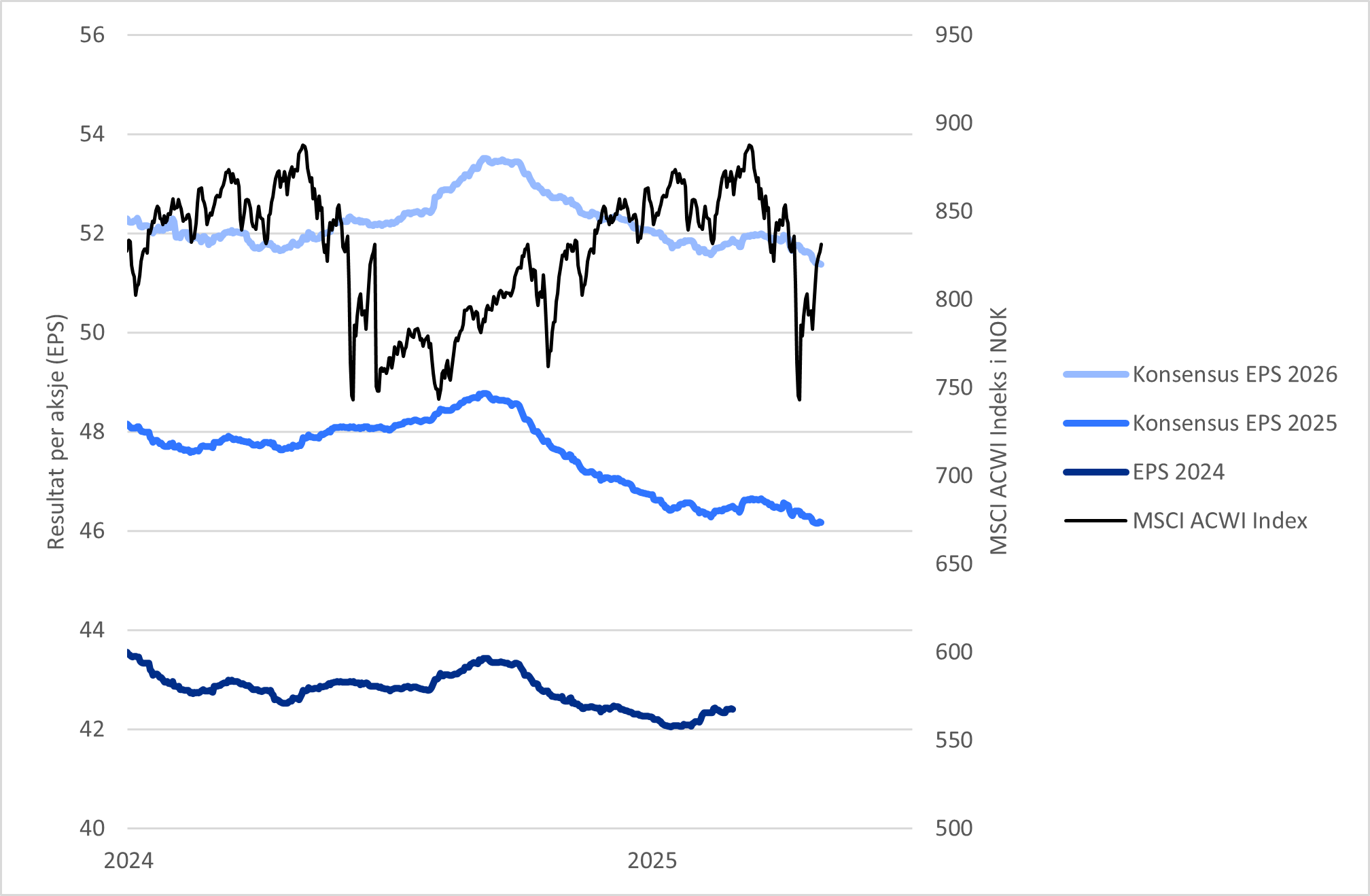 De økte spenningene mellom USA og flere av dets handelspartnere, spesielt Kina og EU, har ført til at analytikere i økende grad nedjusterer sine resultatestimater for en rekke børsnoterte selskaper. Mange av disse selskapene er avhengige av globale leverandørkjeder og eksportmarkeder som nå rammes av høyere tollsatser og økt usikkerhet. Slike nedjusteringer tar noe tid, ettersom analytikerne vil avvente selskapenes resultatfremleggelse for første kvartal 2025 før de nedjusterer sine estimater. Da kan de høre hva ledelsen sier om deres virksomhet og hvordan handelskonflikten vil påvirke selskapets omsetning og resultat fremover. Analytikerne har allerede redusert sine forventninger til selskapenes resultater med 5% for 2025 og 4% for 2026 for verdensindeksen MSCI ACWI (i norske kroner). Selv etter nedjusteringene forventes selskapene i denne verdensindeksen å ha en resultatforbedring på 11% fra 2024 til 2025, noe som virker noe høyt gitt dagens situasjon. Vi blir dermed ikke overrasket om estimatene kan bli ytterligere nedjustert for 2025.