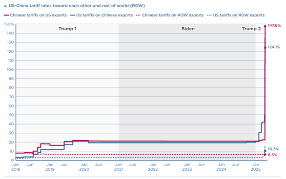Etter at USA og Kina har økt sine tariffer på hverandres produkter flere ganger, har forholdet mellom verdens to største økonomier forverret seg betraktelig. Begge land har i lang tid vært avhengige av hverandre, og deres økonomiske gjensidighet gjør at handelskonflikten kan få alvorlige konsekvenser. Som grafen under viser, har de amerikanske tariffene på kinesiske varer kommet opp i 147,6%, mens tariffer på amerikanske varer til Kina har økt til 124,1%. Dette har i praksis ført til en kraftig reduksjon i handelsaktiviteten mellom de to landene.