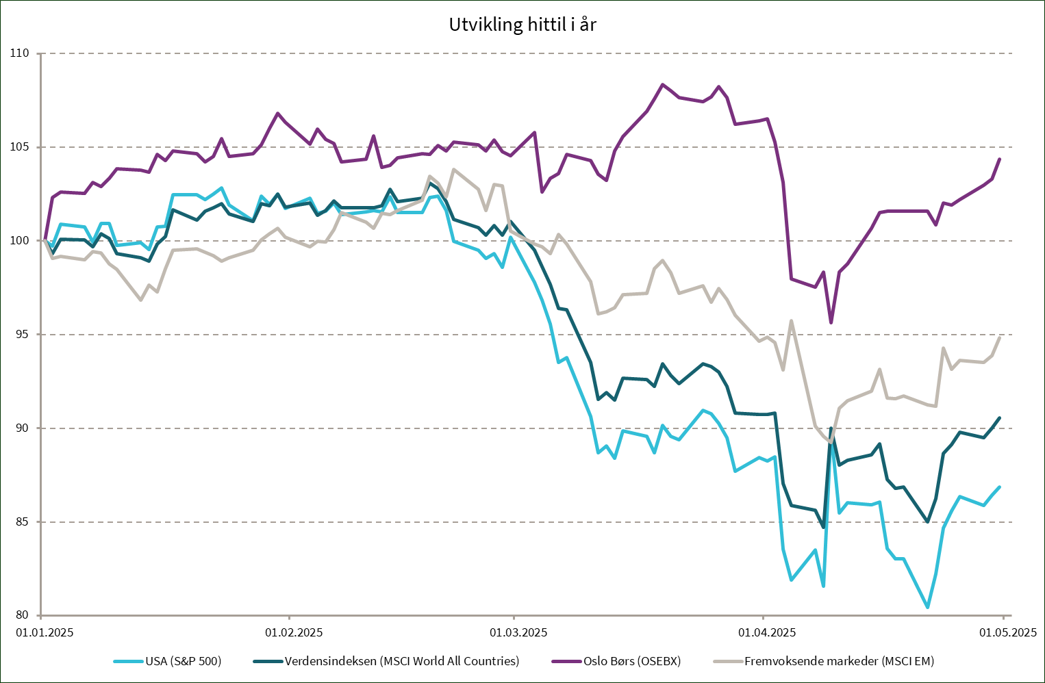 Trumps aggressive tariffpolitikk har uten tvil bidratt til økt markedsuro, svekket global vekst og svekket globalisering. På kort sikt er konsekvensene negative, med redusert handel, lavere forbrukertillit og nedjusterte forventninger til selskapenes resultatutvikling. Likevel er ikke situasjonen statisk. USA har allerede åpnet for mulige endringer i tariffene gjennom en 90-dagers pause, og det er fortsatt håp om at USA kan inngå en handelsavtale med Kina – drevet av sterke gjensidige økonomiske interesser.