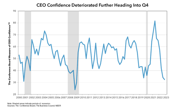 Warren Buffet sa en gang at det er lurt å være «fearful when others are greedy, and greedy when others are fearful». Krig, inflasjon, energikrise, økte renter og risiko for resesjon har ført til at mange har blitt skeptiske til markedene fremover. Fremtidstroen blant ledere i USA er på lave nivåer. Indeksen under viser administrerende direktørers oppfatninger av dagens situasjon og fremtiden. Indeksen er nå nede på veldig lave nivåer, nivåer som er på linje med da pandemien startet våren 2020, finanskrisen 2008 og under IT-boblen i 2000.