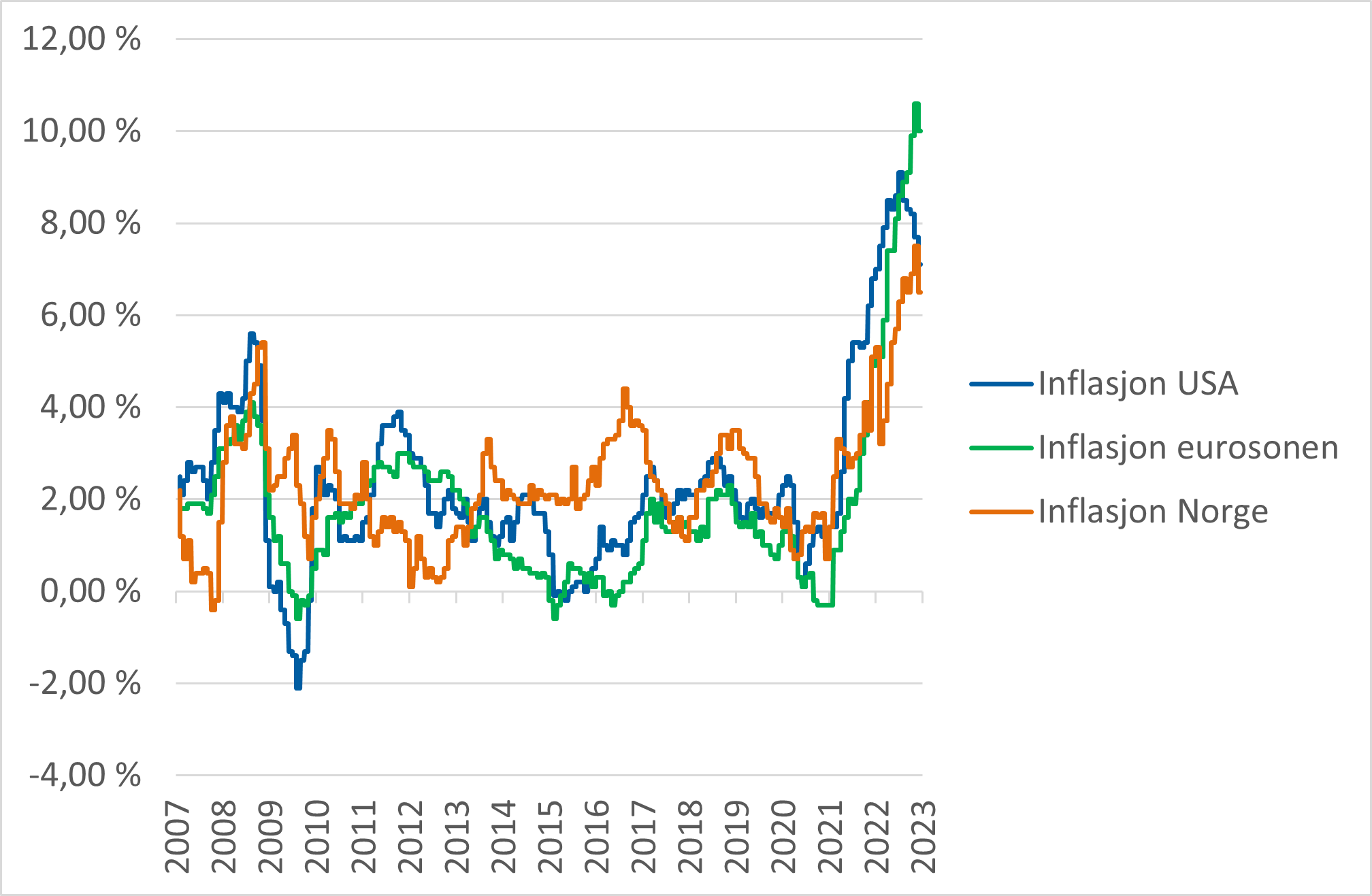 Prisoppgangen i 2022 startet som en følge av krigen i Ukraina og flaskehalser i global transport. Krigen er vedvarende, og det er dessverre ingen løsning i sikte. Men transportproblemene ser ut til å ha blitt mindre. Ratene for frakt av varer har falt betydelig og det finnes nesten ikke kø av skip ved havnene. I tillegg har råvarepriser som kopper, aluminium og olje falt den siste tiden. Økte renter og økte energikostnader vil føre til lavere forbruk. Boligpriser inngår ikke i konsumprisindeksen, men det gjør husleie. Husleie er naturligvis korrelert med boligpriser, men det tar tid før endring i boligpriser slår ut på husleie. Boligprisene i USA har falt siden sommeren 2022 og vil etter hvert kunne senke husleien og dermed redusere inflasjonen.