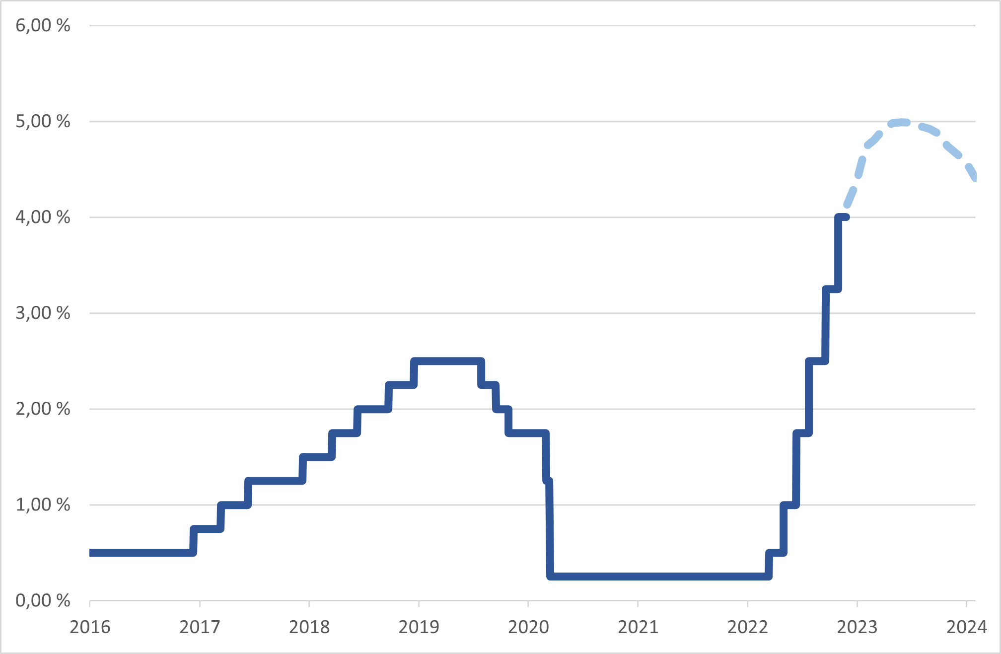 Året 2022 har vært preget av forventninger om renteøkninger. Selv om vi ikke er ferdige med økte styringsrenter, har farten avtatt og prognosene indikerer en topp i nær fremtid. Hvis prognosene holder, vil markedet snart spekulere i hva som vil skje etter rentene har nådd toppen. Hvis økonomien er svak, vil det være en sannsynlighet for lavere styringsrente for å stimulere til økonomisk vekst. Men da må inflasjonen ha kommet ned på akseptable nivåer.