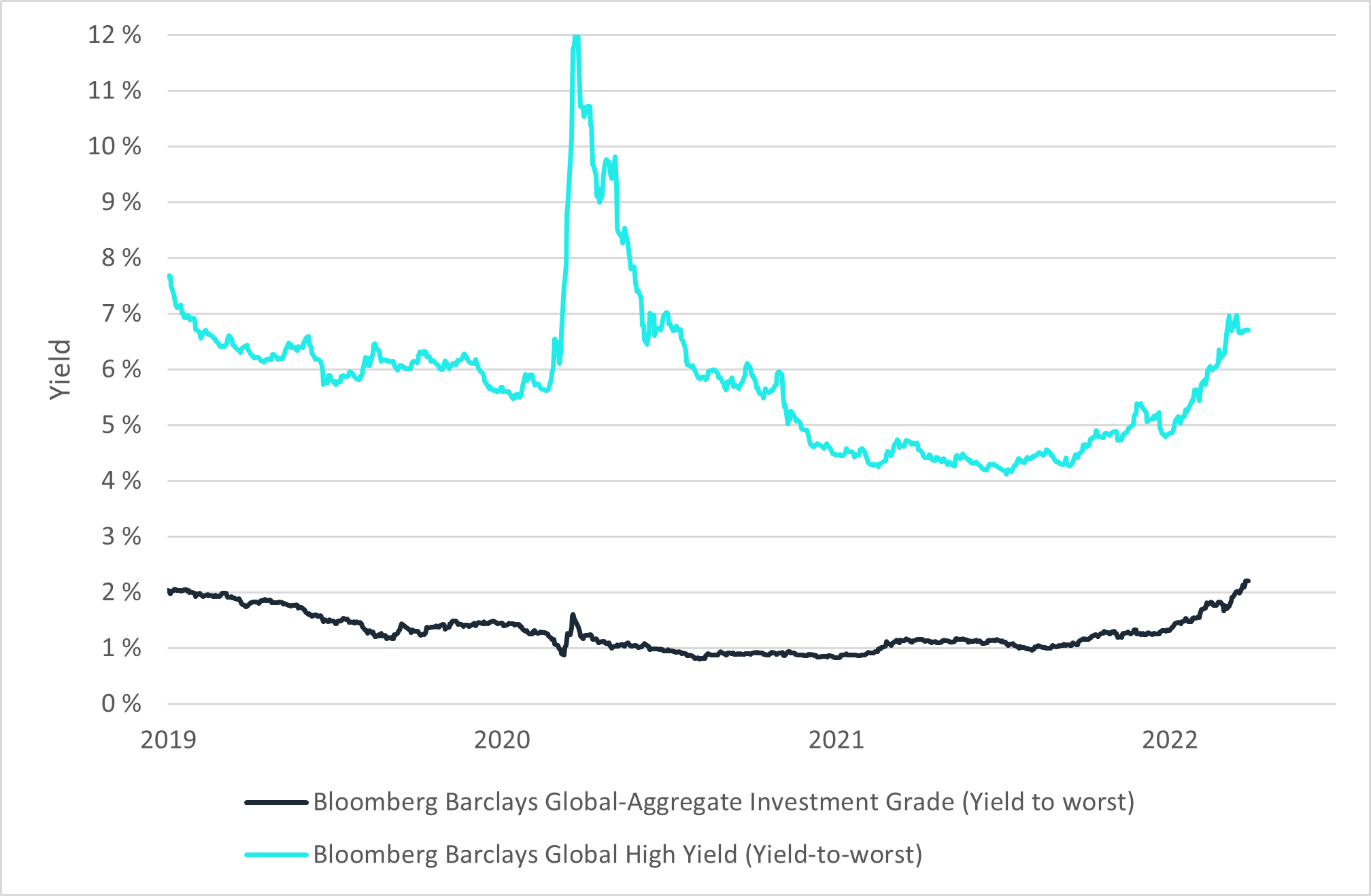 Dessverre har vi ikke tilgang på gode indekser på norske høyrente-obligasjoner og derfor bruker vi globale indekser i stedet. Som grafen under viser har avkastning til forfall steget den siste tiden både for globale lavrisiko- og globale høyrente-obligasjoner.