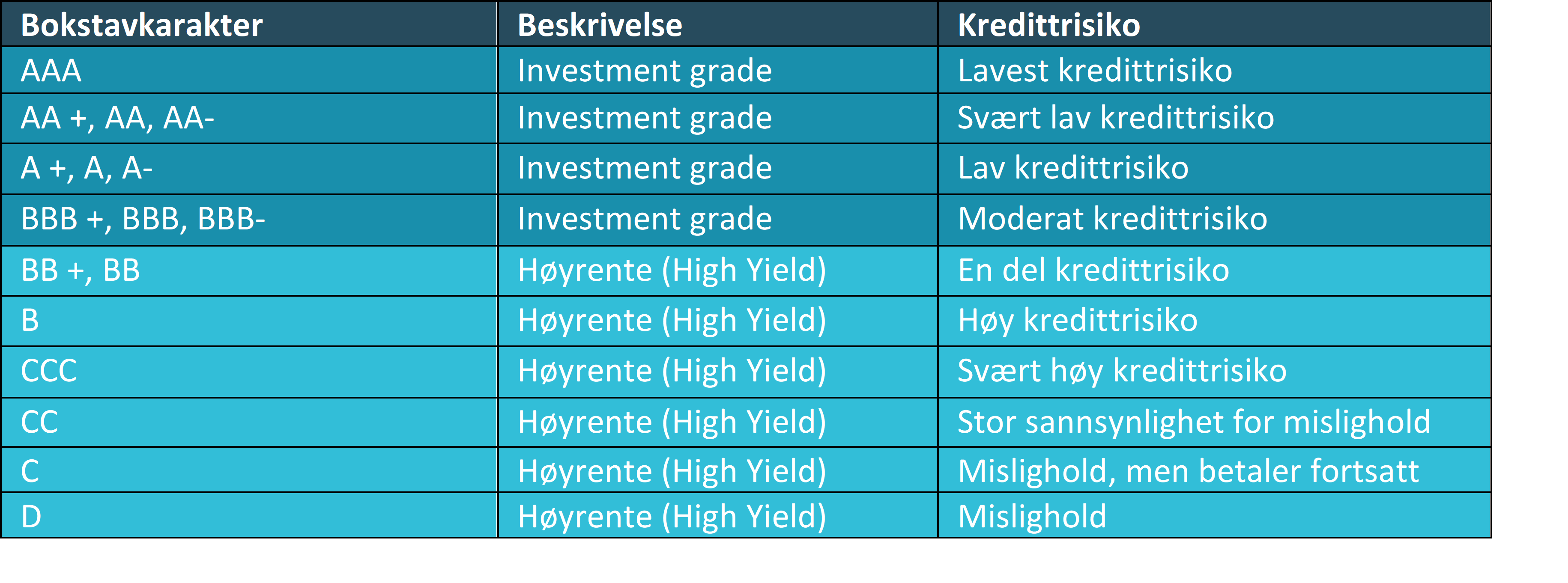 Som tabellen over illustrerer, deles kredittobligasjoner ofte inn i to grupper, «Investment Grade» og «Høyrente«. Investment Grade er betegnelsen for obligasjoner med lav kredittrisiko. Eksempler på slike obligasjoner er obligasjoner utstedt av selskaper som Yara, Tomra, Schibsted, Hydro, DNB og sparebankene. På grunn av liten kredittrisiko er investorene villig til å akseptere lavere rente på lånene.