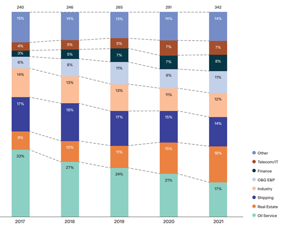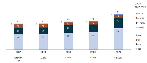 I motsetning til Sverige, hvor eiendom er en dominerende sektor i høyrentemarkedet, er det norske markedet godt diversifisert mellom de ulike sektorene. I 2021 ble det utstedt nye høyrente-obligasjoner på totalt NOK 135 milliarder, noe som var en vekst på 68% sammenlignet med 2020. Eiendom, shipping og industri var de største sektorene. Det norske markedet er attraktivt for utenlandske selskaper og hele 38% av obligasjonene som ble utstedt i det norske høyrentemarkedet ble utstedt av selskaper utenfor Norden.