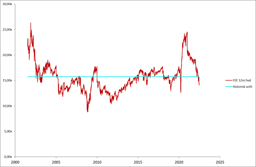 Fallet i aksjemarkedet har ført til at aksjer handles til lavere inntjeningsmultipler. Inntjeningsmultipler, eller price/earnings (PE), viser forholder mellom verdi på et selskap og resultatet. Sagt på en annen måte, en PE på 15x betyr at selskapets markedsverdi er 15 ganger resultatet (her brukes gjerne estimert resultat neste 12 månedene). Etter siste tids fall i aksjekurser prises aksjene i verdensindeksen under sitt historisk gjennomsnitt. Det er dog en risiko for at analytikerne vil nedjustere sine estimater fremover og da vil multiplene kunne gå opp noe.