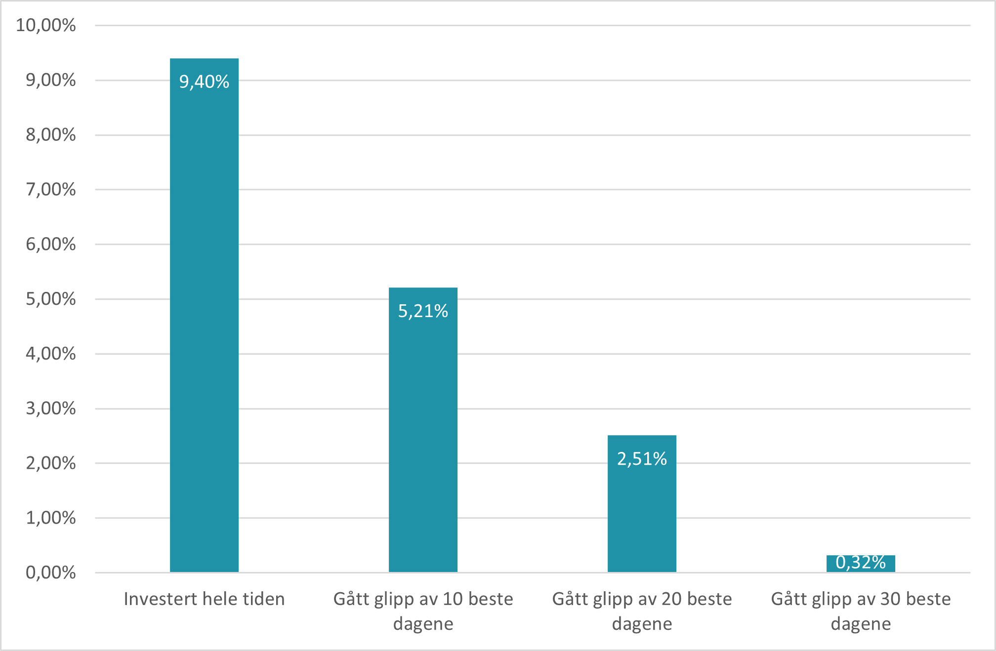 Som nevnt tidligere er utfordringen med timing at man skal treffe på riktig tidspunkt for salg og riktig tidspunkt for kjøp. Det er særlig vanskelig å vite når aksjemarkedet er nær bunnen for da er utsiktene dårligst og veldig få ønsker å ta mer risiko. Dessverre er ofte de beste dagene i aksjemarkedet rett etter bunnen er nådd. Dersom du går glipp av disse gode dagene, vil avkastningen bli svakere. Ifølge JP Morgan er 7 av de 10 beste dagene innenfor 15 dager etter de verste 10 dagene.