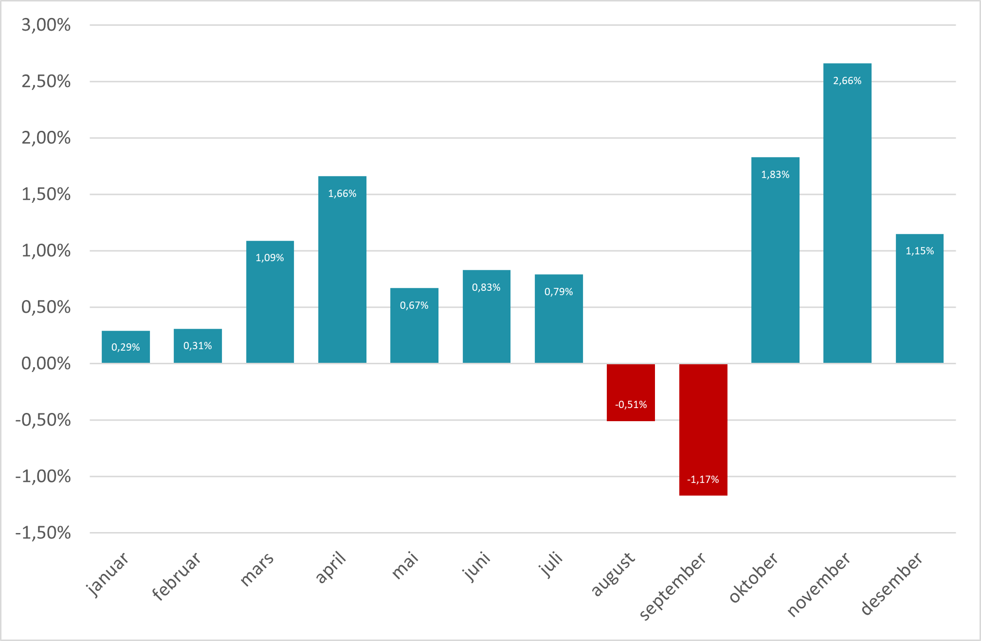 Figur 4 – Sesongmønster i aksjemarkedet 1997-2022 (MSCI World All Countries, USD)