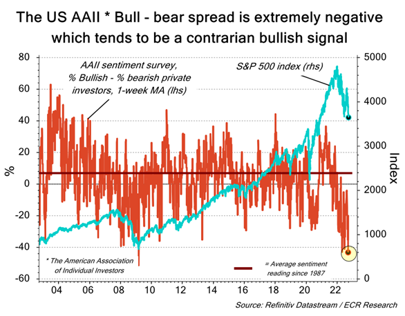 En amerikansk spørreundersøkelse blant amerikanske investorer om de er positive (bullish) eller negative (bearish) til aksjemarkedet de neste seks månedene viser en rekordhøy andel som er negativ. Kun 17% tror på oppgang mens 61% tror på nedgang. Historisk har undersøkelsen vært en god indikator for når det er et godt tidspunkt å kjøpe. Jo flere som er negative til markedet, jo større sjanse er det for at markedet stiger. Vi må tilbake til mars 2009 for å finne en større andel av investorene som er negative til markedet. Mars 2009 var bunnen i aksjemarkedet etter finanskrisen.