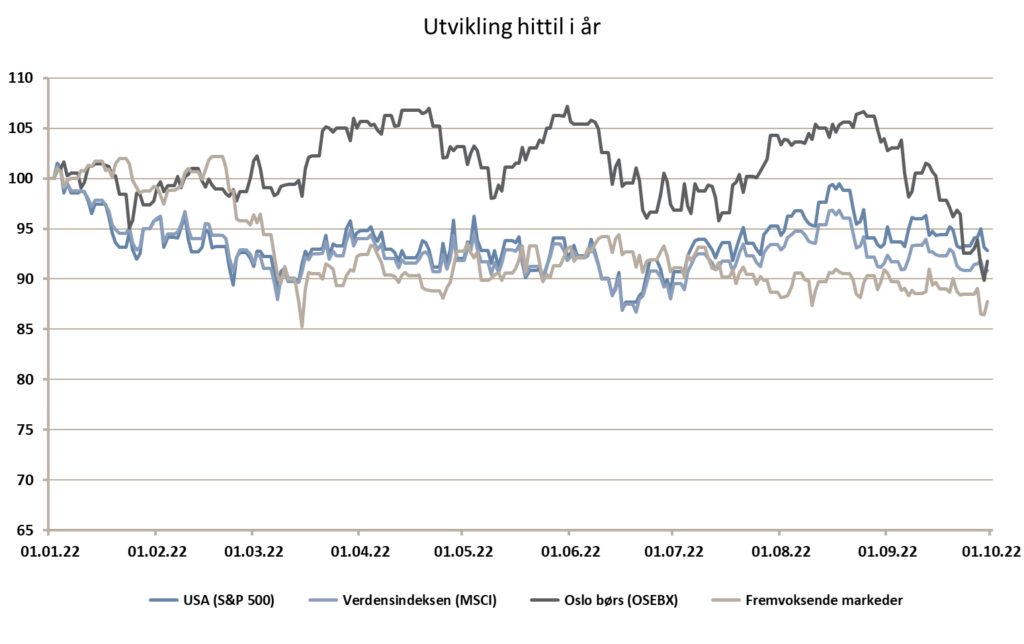 Verdensindeksen MSCI World All Countries har kun falt 8% i norske kroner så langt i år. Men kronen har svekket seg i perioden og målt i US dollar, har indeksen falt med 25% så langt i år. Det er ganske mye i løpet av et år og er det nest-dårligste året siden 1980. I 2008 falt markedet 41% og dersom nedturen skal bli like stor som i finanskrisen er det fortsatt nedside. Men bankene er bedre rustet i dag enn i 2008 og vil nok tåle en nedtur bedre. Det er også viktig å nevne at aksjemarkedet steg 30% i 2009.