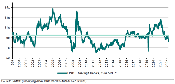 Bankene er også lavt priset relativ til forventet inntjening de neste 12 månedene. Som grafen under viser, prises norske banker til en P/E (Price/Earnings) på lave 7,6x for 2024. Det er under historisk gjennomsnitt.
