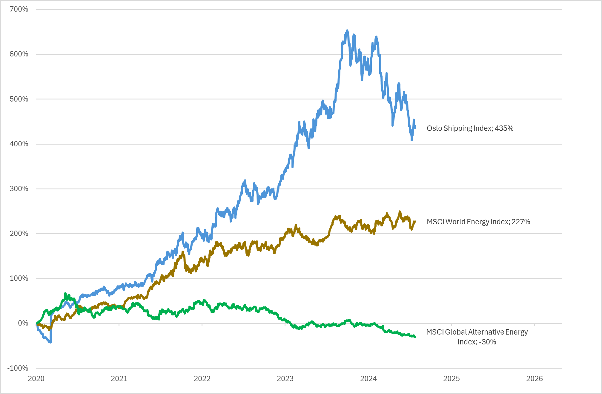 Figur 1 – aksjekursutvikling i shipping, energi og alternativ energi siden DNB Navigator ble avviklet