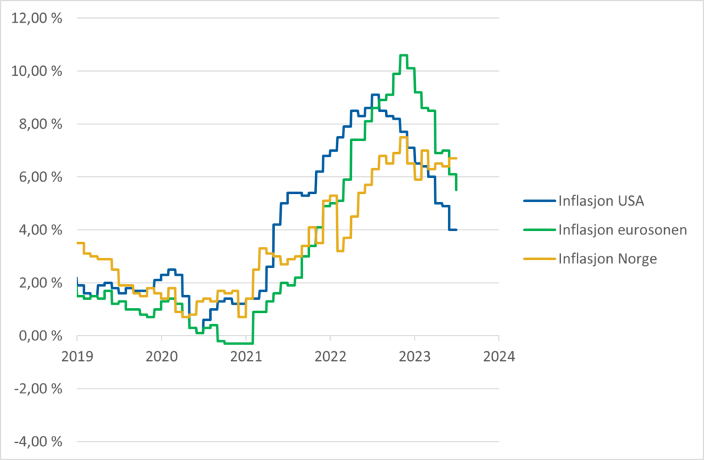 Inflasjonen i USA og Europa er på retrett, drevet av en kombinasjon av økte renter, fallende energipriser og færre flaskehalser innen transport- og logistikksektoren. Disse faktorene har sammen skapt et miljø hvor prispresset har begynt å avta og denne utviklingen kan ha betydning for pengepolitikken fremover. Med inflasjonen på vei ned, er det sannsynlig at markedet kan se toppen av rentehevingene i høst. Dette vil være et viktig vendepunkt, som kan signalisere en overgang til en mer stabil økonomisk periode, hvor inflasjonspresset avtar og økonomien kan fortsette å vokse på et mer bærekraftig nivå.