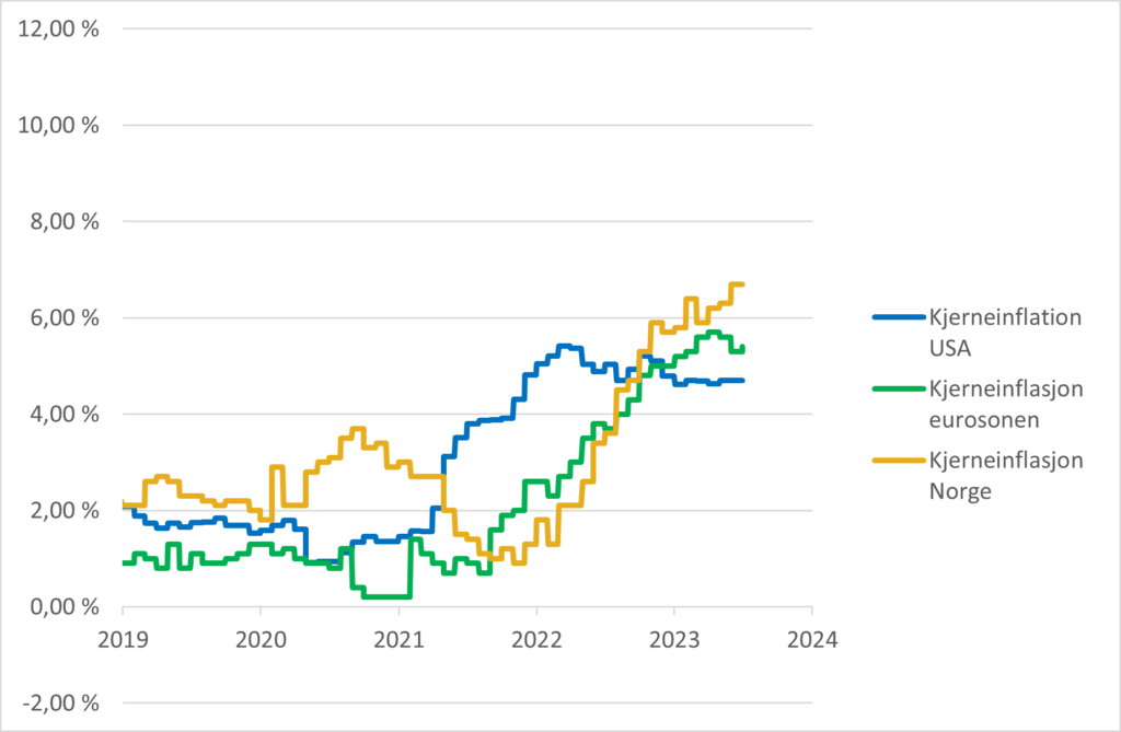 Det eneste sentralbankene sliter med er at kjerneinflasjonen ikke har falt mye, om noe. Fall i energipriser har ført til lavere inflasjon, men justert for energipriser ser vi få tegn til at prisøkningen avtar. Det innebærer at sentralbankene vil fortsette renteøkningene for å nå målet om 2% inflasjon.