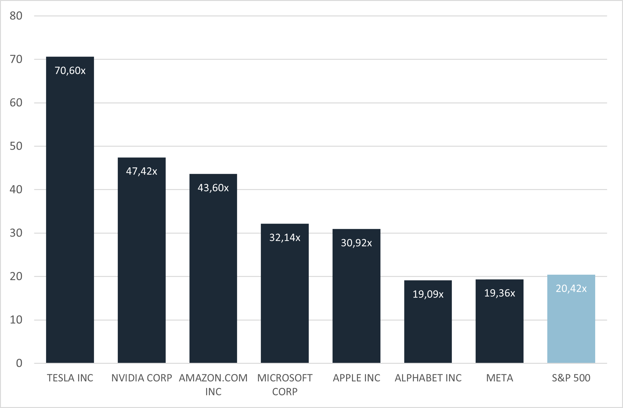 I løpet av 2023 har aksjekursene til de syv største amerikanske teknologiselskapene sett en betydelig økning, drevet av en økende interesse for kunstig intelligens. Indeksen S&P 500 har steget med 14%, men analytikerne har ikke økt sine inntjeningsforventninger i samme periode. Dette indikerer at det er inntjeningsmultiplene, mer enn selve inntjeningen, som har drevet aksjekursene oppover. Oppgangen i S&P 500 kan i stor grad tilskrives de syv store teknologiselskapene. Det faktum at så få selskaper har bidratt til den samlede oppgangen i S&P 500 utgjør imidlertid en risiko for at de samme selskapene kan bidra til en nedgang, særlig med tanke på disse selskapenes høye prising.