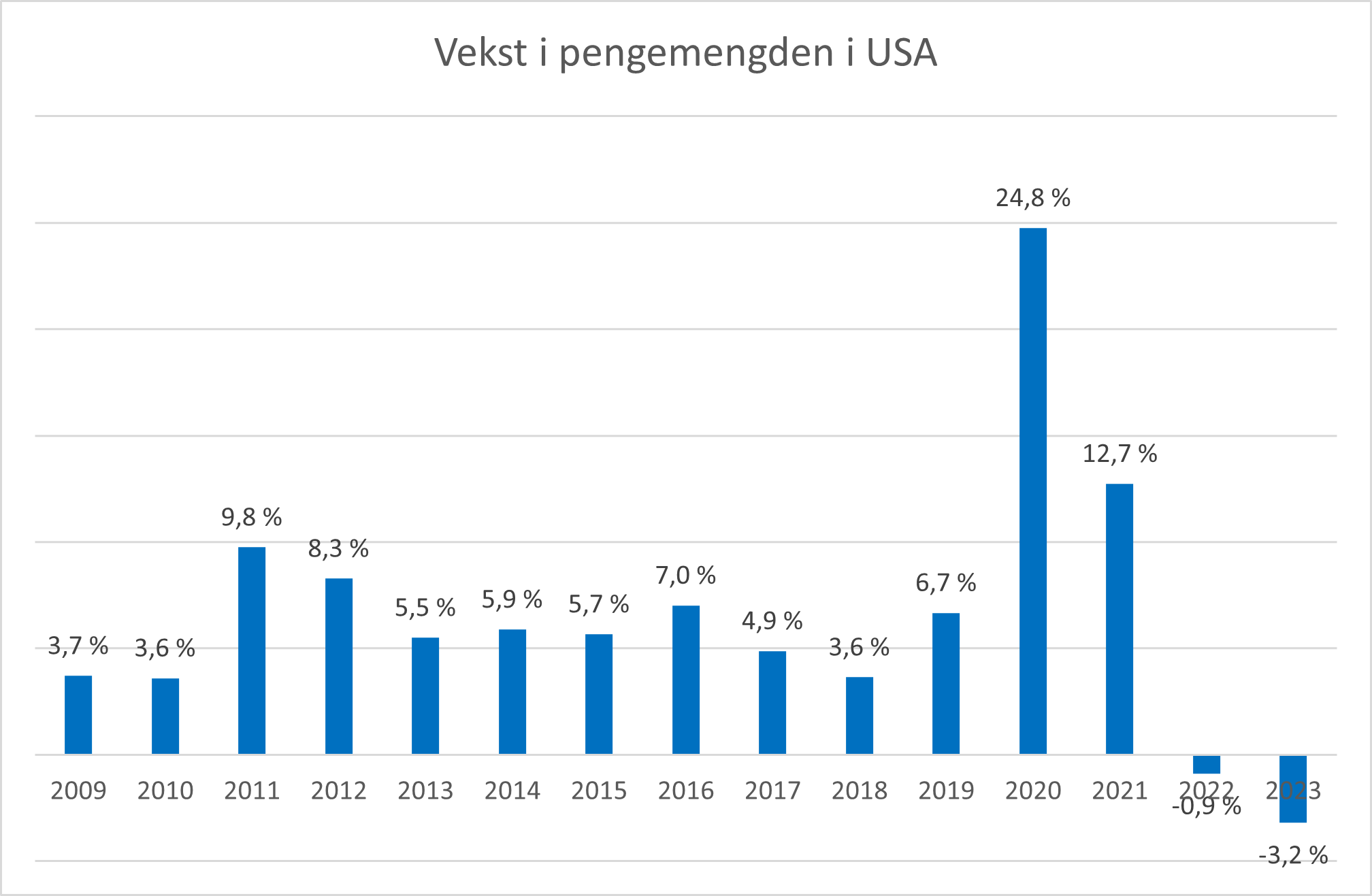 I løpet av pandemien opplevde USA en betydelig økning i pengemengden, målt ved M2, som inkluderer kontanter, innskudd og lett omsettelige investeringer. For å bekjempe de økonomiske effektene av pandemien, implementerte myndighetene og sentralbanken tiltak som førte til en vekst i pengemengden på 24,8% i 2020 og 12,7% i 2021. Disse tiltakene omfattet en politikk kjent som «quantitative easing» (QE), som involverer kjøp av langsiktige verdipapirer for å øke pengemengden og reduksjon av rentenivået for å oppmuntre til økonomisk aktivitet. Imidlertid, etter en periode med QE, er det tid for det motsatte, kjent som «quantitative tightening» (QT). Dette innebærer at sentralbanken reduserer pengemengden ved blant annet å selge verdipapirer og øke styringsrenten.