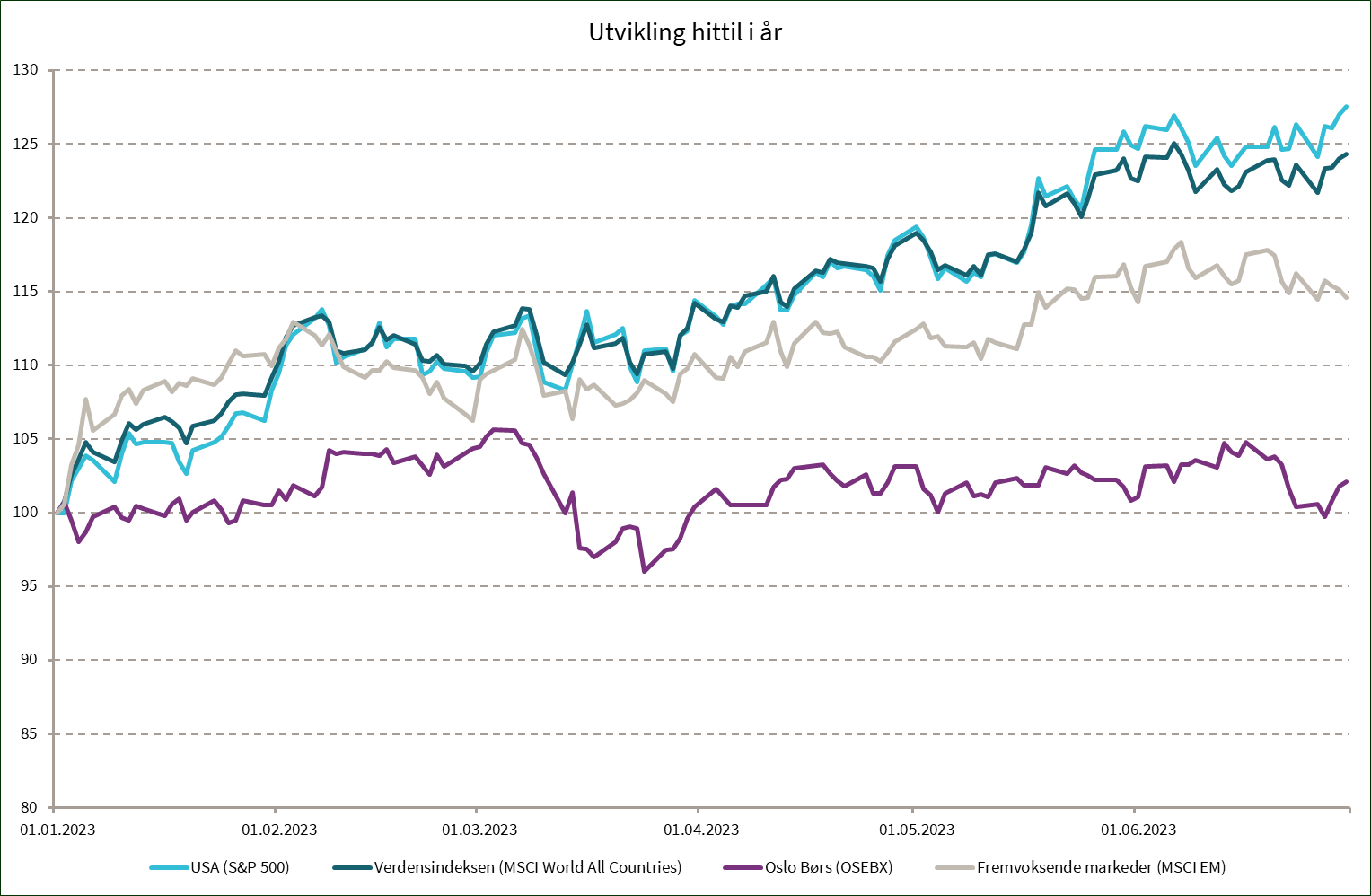 Finansielle markeder befinner seg i et paradoks. På den ene siden er det en bekymring for at flere makro-indikatorer peker mot en svakere økonomi. Høyere renter for å redusere inflasjon, kombinert med innkjøpssjefenes advarsler om tøffere tider i industrien, gjør investorer urolige. Den fallende rentekurven forsterker bildet av svakere økonomisk vekst og mulighet for resesjon. På den andre siden har det internasjonale aksjemarkedet steget over 20% dette året (dog kan omtrent halvparten av denne økningen tilskrives en svak norsk krone). Dette fører oss til det store spørsmålet: Hvorfor er aksjemarkedet så optimistisk når makroindikatorene er så svake?