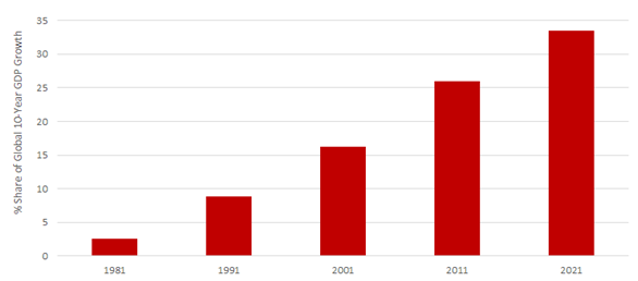 Kina’s vekst de siste årene har vært viktig for global økonomi og de siste 10 årene har Kina stått for 33% av global vekst, mens USA kun har stått for 10%.