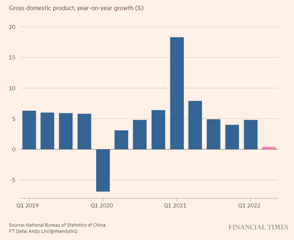 Kina har lagt bak seg et kvartal med en økonomisk vekst på kun 0,4%, den nest dårligste veksten på 30 år. Halvårsvekst på 2,5% er skuffende, særlig med tanke på at kommunistledelsen har en målsetning om 5,5% vekst for 2022. Detaljhandel falt med 4,6% i andre kvartal, mens industriproduksjonen steg med 3,9%. Shanghai har vært nedstengt store deler av andre kvartal på grunn av koronarestriksjoner, noe som påvirker detaljhandelen.