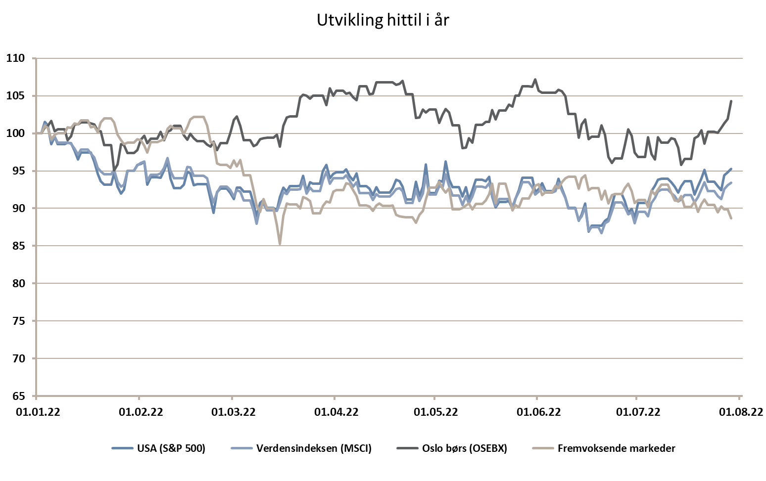Kinesiske aksjer børsnotert i Hong Kong har hatt svak utvikling de siste årene og Hang Seng-indeksen er ganske nær sitt laveste nivå på 5 år. Kinesiske aksjer er lavt priset, både absolutt og relativt til andre markeder. Kinesiske myndigheter har mange utfordringer fremover. De må få ordnet opp i et urolig eiendomsmarked, få dreiet økonomien fra investeringer til forbruk, få åpnet opp byer etter strenge smitte-restriksjoner og bedre relasjonene med den vestlige verden. Klarer de det, kan oppsiden være stor.