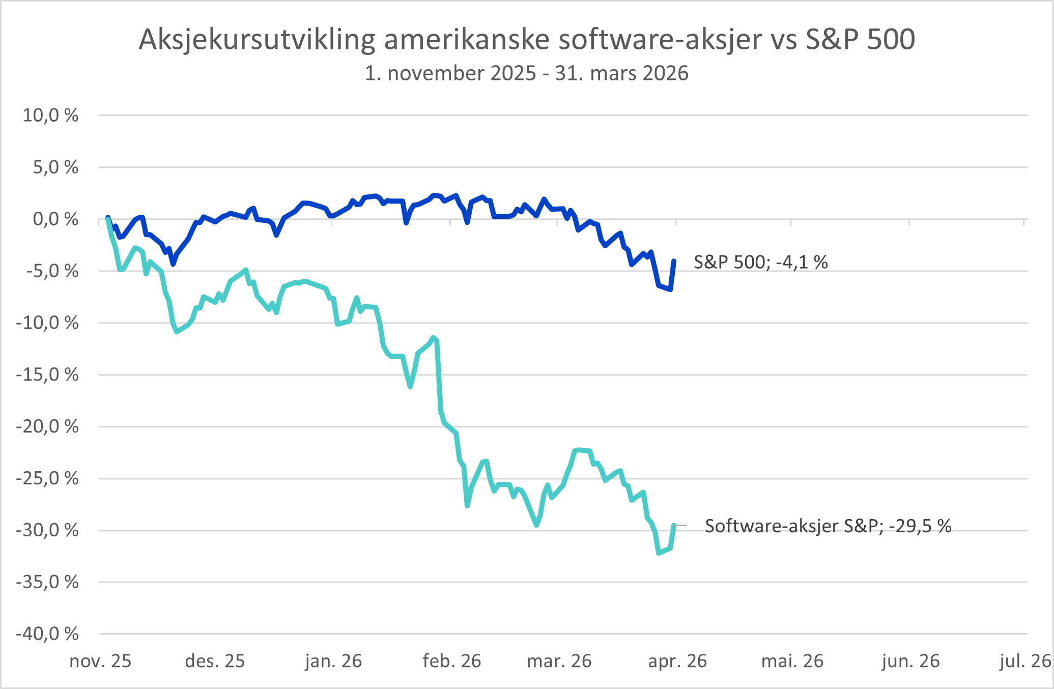 I februar og mars skjedde det noe i markedet som svært få kunne forutse. Anthropic lanserte Claude Code, Claude Cowork og Claude Code Security. Markedet vurderte det dit hen at nye KI-løsninger nå var så effektive at de kan true kjernevirksomheten for en lang rekke programvareselskaper. Frykten bestod i at juridisk arbeid, analyse og beslutningsstøtte kan automatiseres. Software-aksjer i USA falt brått nesten 30 prosent på kun få uker. De som trodde de var på en kort solskinnstur i teknologisektoren, møtte uvær.
