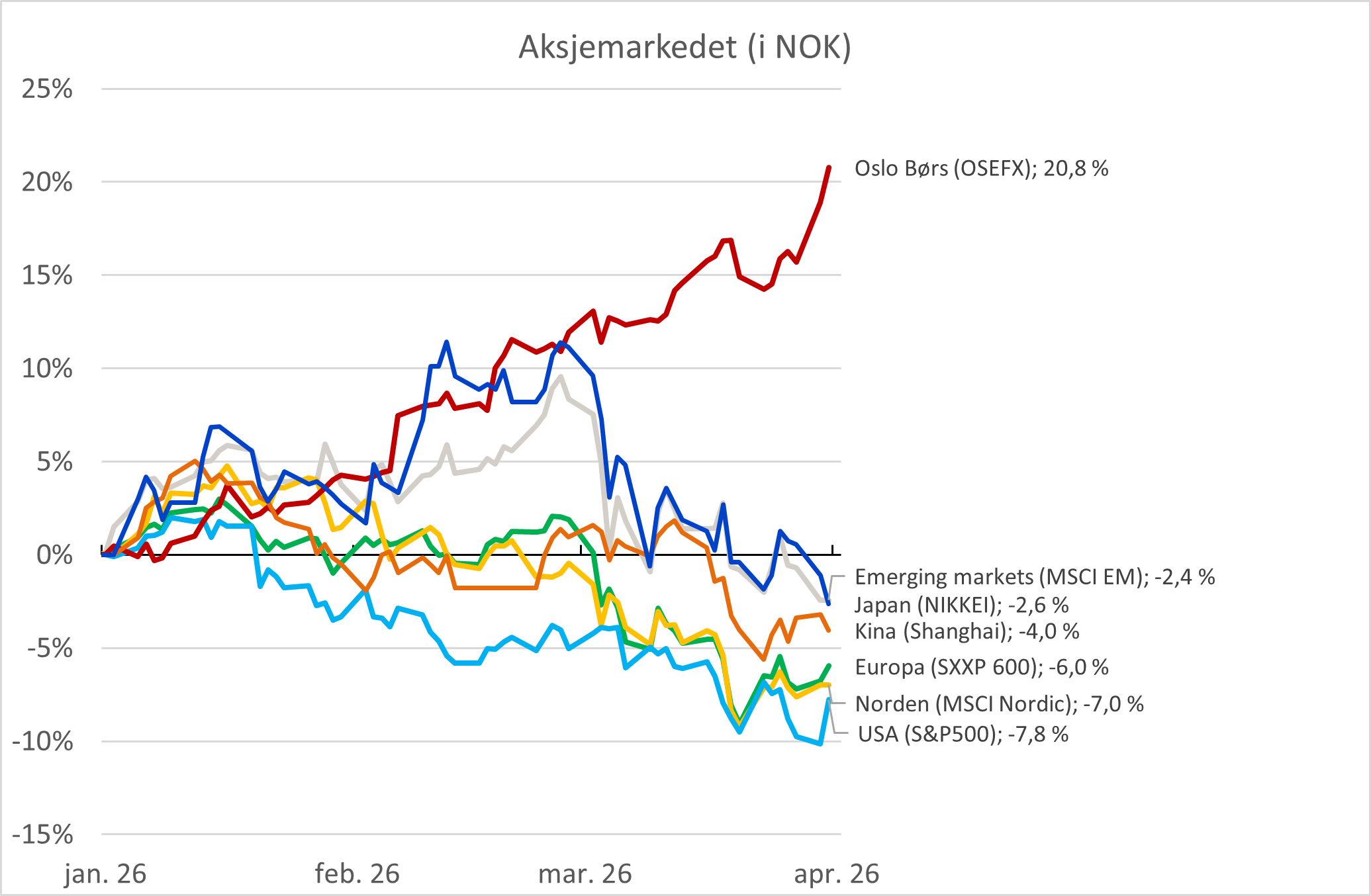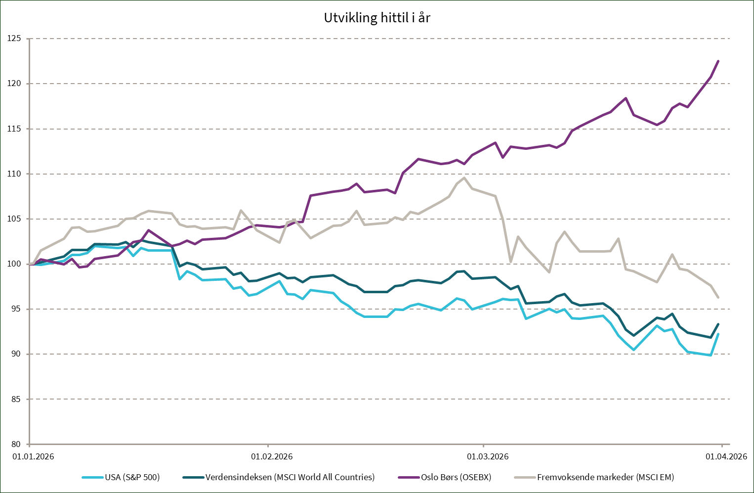 Det er flere likheter mellom finansmarkedene og påskefjellet. Det er til tider stor nytelse med høye temperaturer og mye sol, men det finnes også mange potensielle farer. USA og Israel sitt angrep på Iran i slutten av februar har ført til at Hormuzstredet i Persiagulfen er stengt, og at 20 til 30 prosent av verdens olje- og gass-konsum ikke kan fraktes ut. Nye AI-verktøy har sendt verdien av store software-selskaper ned over 20 prosent på noen få uker. Markedet tror nå at Norges Bank kanskje må øke styringsrenten i 2026. Oslo Børs er opp over 20 prosent hittil i år, mens amerikanske aksjer er ned ca. 10 prosent (målt i NOK).