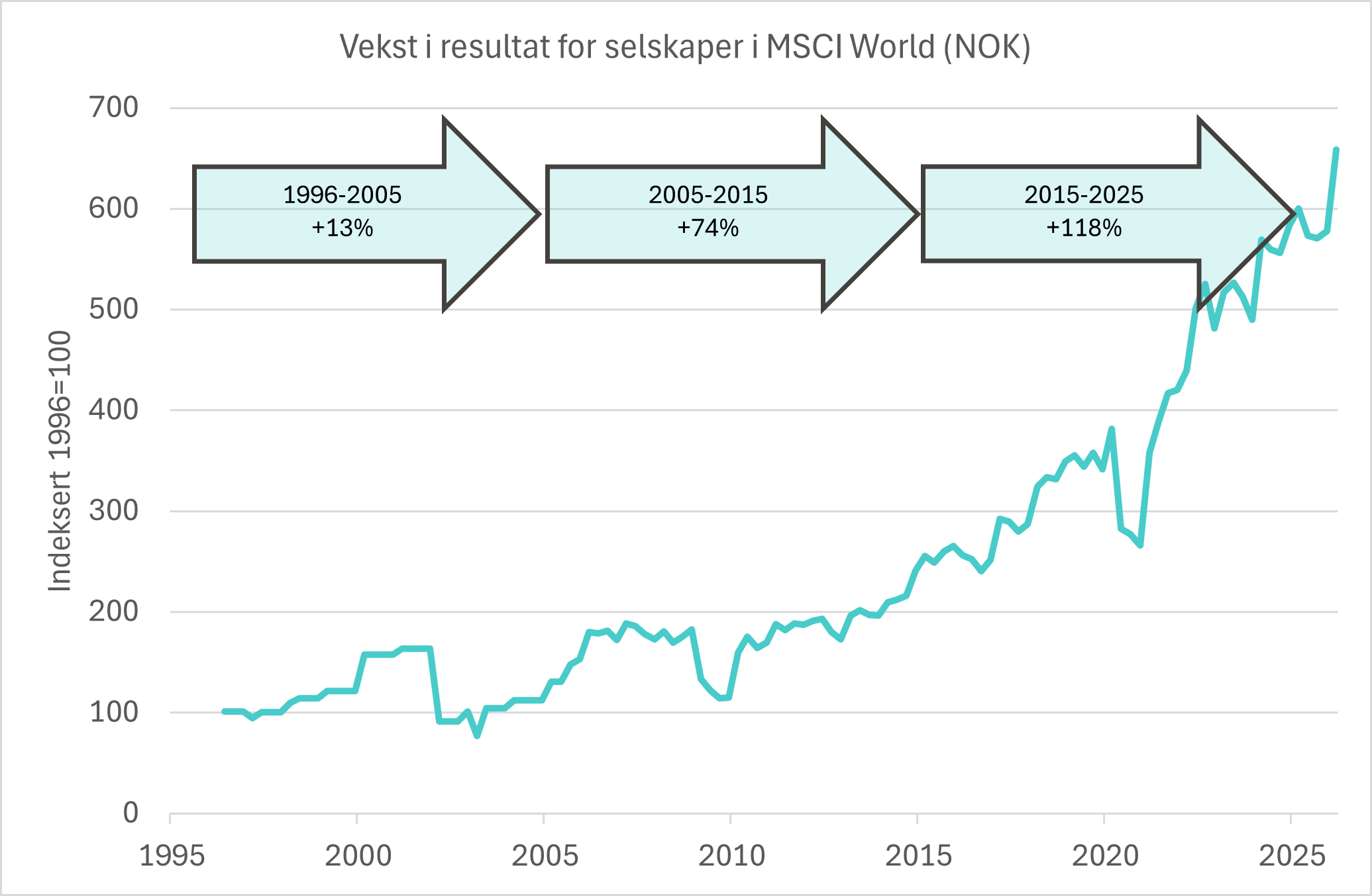 Som grafen under viser, har resultatveksten til globale børsnoterte selskaper økt kraftigere de siste 10 årene (+118%), enn 10-års-periode 2005-2015 (+74%) og 9-årsperioden 1996-2005 (+13%).