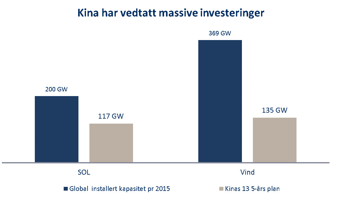 Etter at dokumentaren om den ekstreme forurensningen i kinesiske byer, «Under the Dome» – youtube video, ble sett flere hundre millioner ganger før den ble fjernet fra nettet av sensurmyndighetene, har Kommunistpartiet lansert en storstilt satsing på fornybar energi i den trettende femårsplanen. Kina skal bygge ut solceller, vindmøller og vannkraft i en skala vi aldri tidligere har sett. Solcelle-satsingen er ekstra interessant fordi den utgjør ca. 60% av alt som tidligere har vært bygget ut globalt. I tillegg har mange andre nasjoner, blant annet India, også store planer på området.