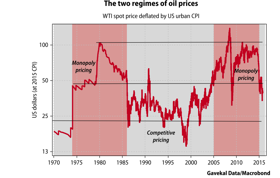 Skifer-revolusjonen har fundamentalt endret oppfatningen hos ledelsen i den styrende produsenten, Saudi-Arabia, om oljen som en knapp ressurs. Med de enorme ukonvensjonelle oljereservene og fremskrittene innen fornybar energi har oppfatningen endret seg til at det finnes mer enn nok olje, og at man vil la olje ligge igjen i bakken. Saudiene, med sine enorme reserver, har således mest å tape på å kutte sin egen produksjon og har derfor bestemt seg for å la pumpene gå for full maskin. Slik har markedet endret seg fra å være et oligopol med én dominerende aktør, OPEC, som begrenser volumet for å maksimere profitt over tid, til et fritt, konkurranseutsatt marked der det er rasjonelt å produsere mer så lenge prisen er over den marginale produksjonskostnaden. Som grafen fra Anatole Kaletsky viser, har vi vært i et konkurranseutsatt prisingsregime før: