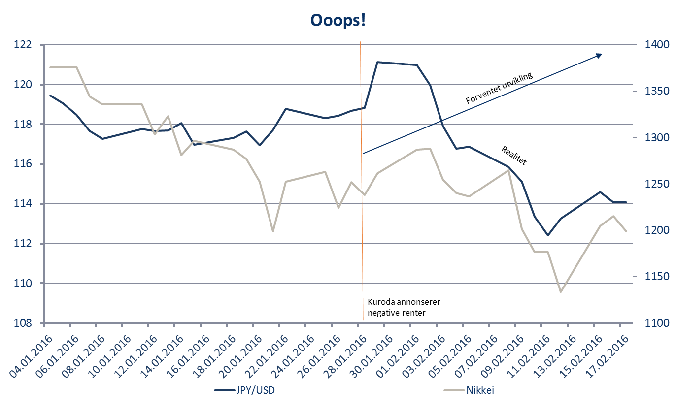 Den generelle oppfatningen i markedet, eller «storyen», er i ferd med å endre seg fra at sentralbankene vil redde investorene dersom markedet faller, til at de ikke lenger er i stand til å kontrollere markedsutfall. Endringen er viktig ettersom veldig mange investorer på grunn av denne overbevisningen har hatt en «buy the dip»-strategi, og blitt belønnet for det i flere år. Med sviktende tillit til sentralbankenes evner forsvinner også motivasjonen til å forfølge en slik strategi, og dermed prisstøtten vi har sett etter mindre fall i markedet de siste årene. Det store skiftet i denne storyen kom etter at Japans sentralbanksjef, Haruhiko Kuroda, innførte negative renter i Japan kun et par uker etter at han hadde benektet at en slik politikk overhodet var aktuell. Markedets umiddelbare reaksjon var å sende det japanske aksjemarkedet ned og yenen opp i løpet av sekunder, det motsatte av det forventede utfallet. Markedet snudde imidlertid litt opp i løpet av dagen etterhvert som Kurodas kommunikasjonsavdeling hadde fått bearbeidet markedet (og antagelig gjort støttekjøp). De påfølgende dagene fortsatte markedet å gå feil vei for Kuroda, og tilliten til sentralbankene begynte å rakne.