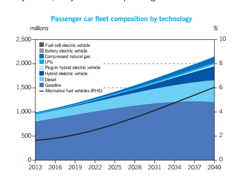 «By 2040, only 6% of the passenger car stock and 5.3% of commercial vehicles will be running on non-oilfuels. Without a technologybreakthrough, battery electric vehicles are not expected to gain significantmarket share in the foreseeable future. Besides the high purchase price, there are serious challenges in terms of convenience, such as rangelimitations and poor battery performance during very hot or cold weather conditions.» Kilde: OPEC World Oil Outlook 2015