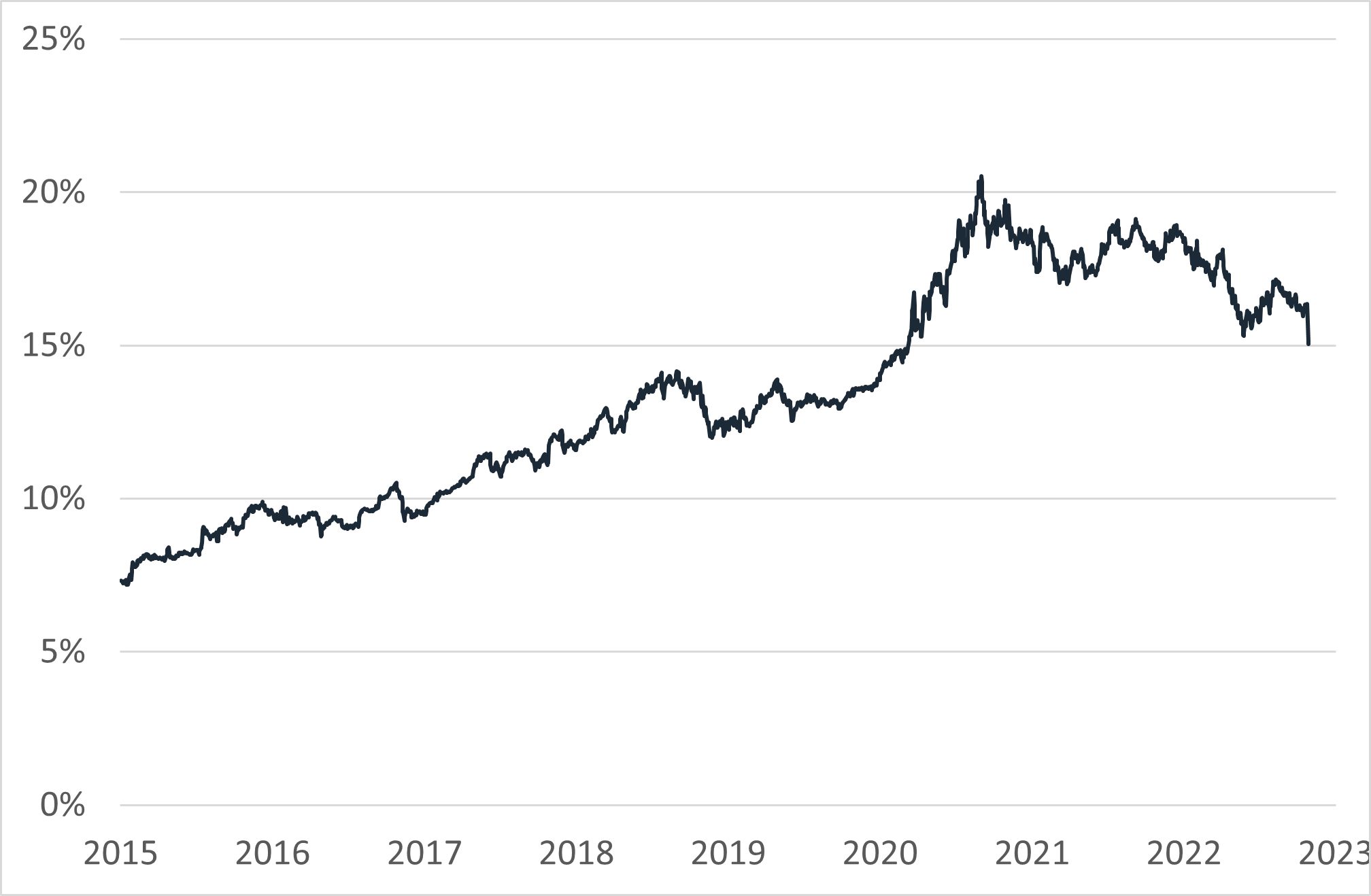 Geopolitisk uro og krigen i Ukraina har ført til volatile markeder og store svingninger i ulike råvaremarkeder. De store teknologiselskapene har gått fra å være alles yndlinger til å bli en sektor som opplever økt konkurranse og svakere vekst. Markedet er derfor ikke lengre villig til å betale en høy pris for slike selskaper.