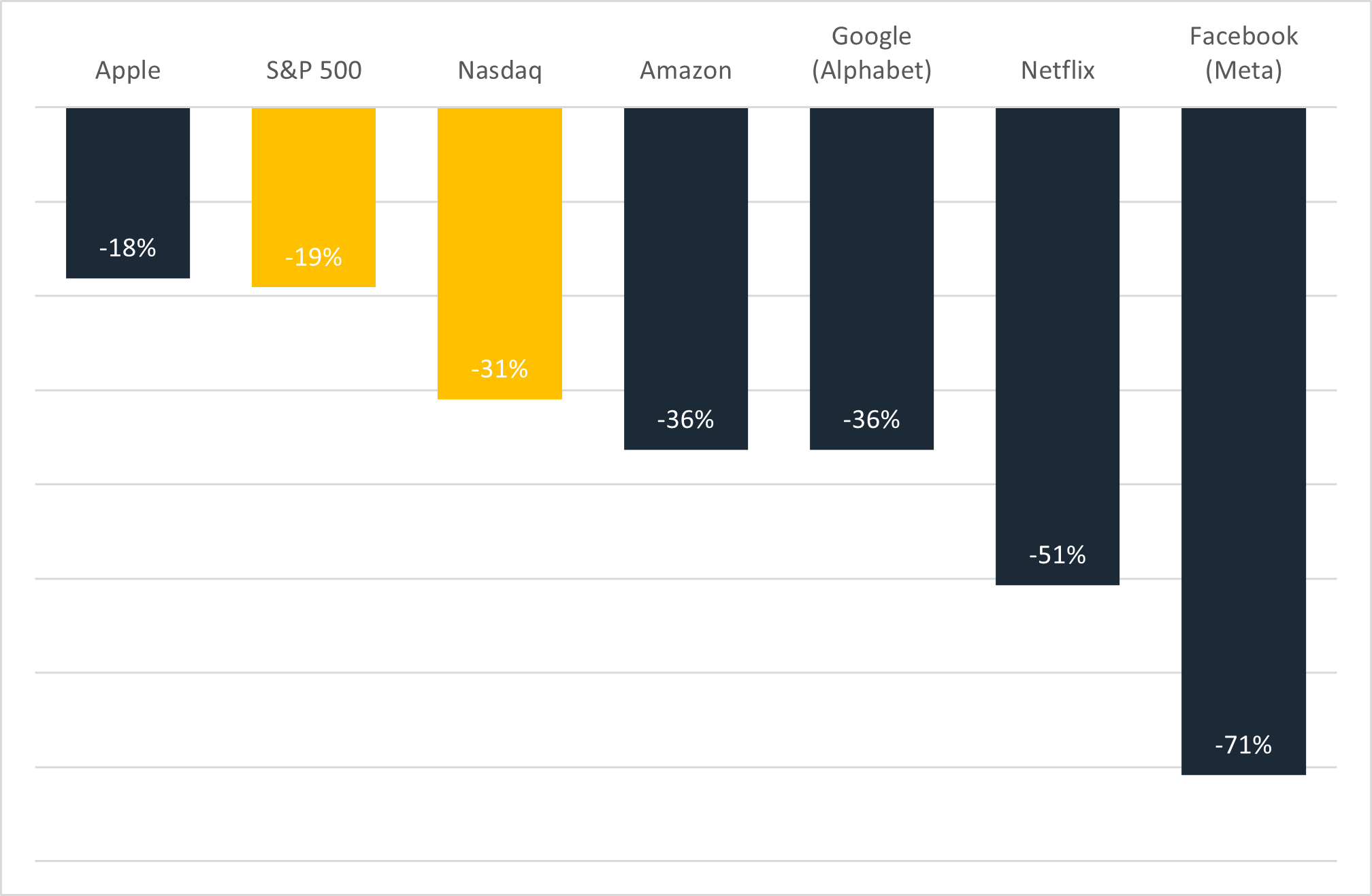 Flere av FAANG-selskapene har hatt dårlig utvikling i år. Som grafen under viser, har det gått verst utover aksjonærene i Facebook og Netflix med fall i aksjekursene på hhv 71% og 51%. Bortsett fra Apple har alle FAANG-selskapene gjort det svakere enn både S&P 500-indeksen og den teknologitunge NASDAQ-indeksen.