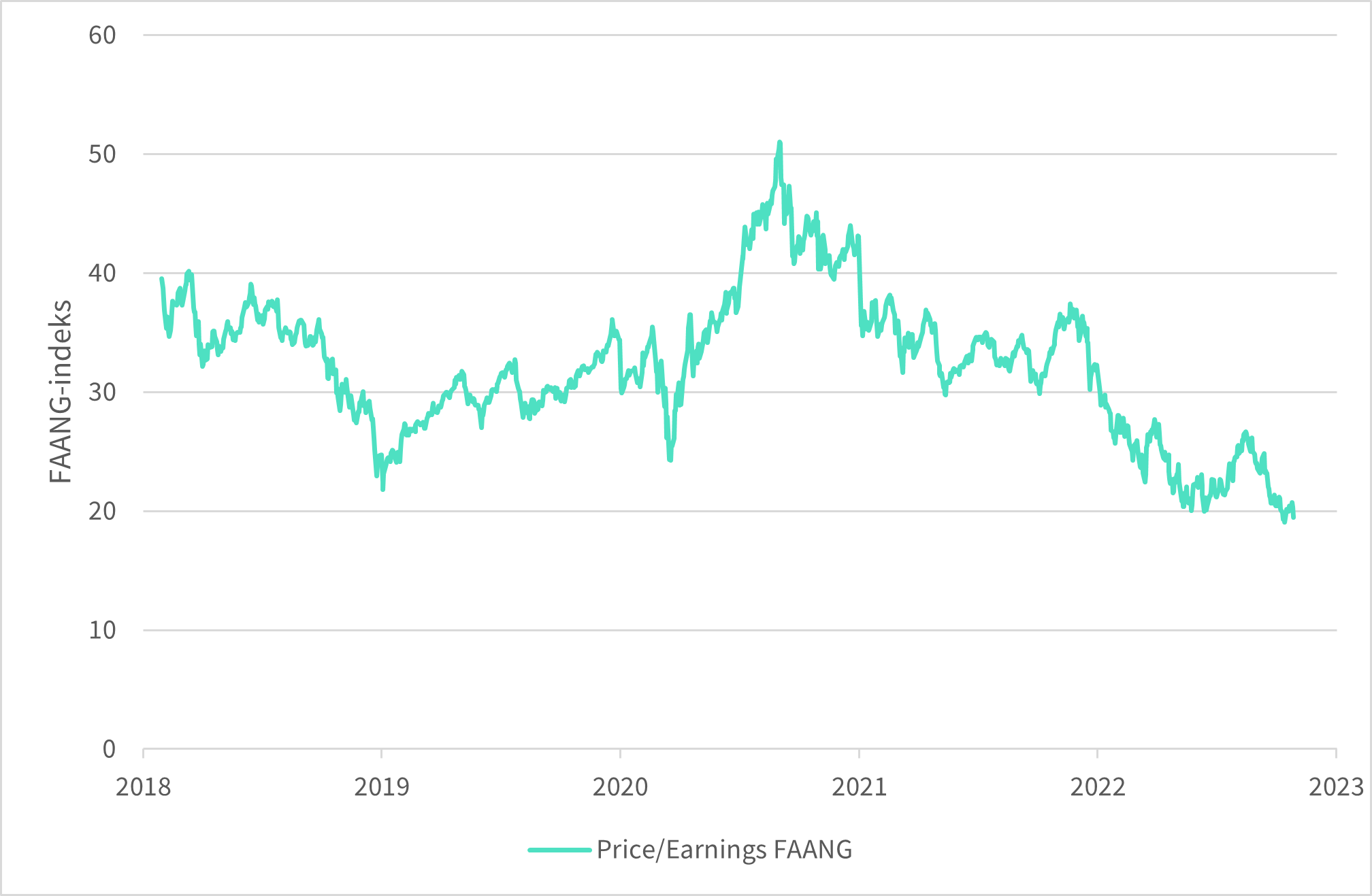 Nedgangen i FAANG-selskapenes aksjekurs skyldes flere ting. Vekstforventningene har kommet ned og markedet er derfor ikke villig til å betale så høy pris for selskapene. Økte renter vil også påvirke teknologiselskaper og andre vekstselskaper. Price/Earning (PE) for FAANG-selskapene, det vi si hvor mye et selskap er verdt relativt til selskapets resultat de neste 12 månedene, har falt fra 50x i august 2020 til dagens nivå på 20x.