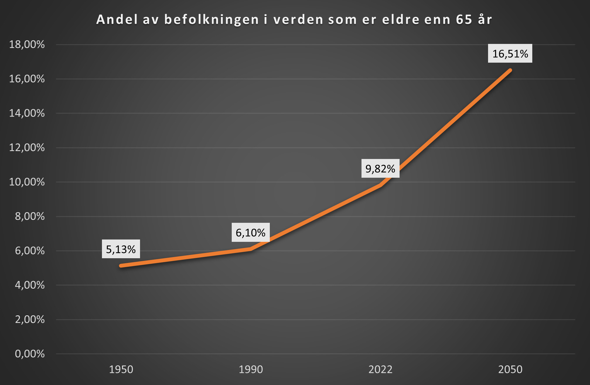 Andel av den globale befolkningen som er over 65 år øker. I 1990 var andelen 6,1%. I dag er den nesten 10% og i 2050 forventes den å være 16,5%. Dette skyldes store barnekull etter krigen og økt levealder. Europa og Nord-Amerika har en aldrende befolkning hvor nesten 19% er over 65 år. Til og med Kina har fått en eldre befolkning med over 12% av befolkningen over 65 år. I Japan er hele 29,1% av befolkningen over 65 år. En stor andel av befolkning over 65 år betyr implisitt en lavere andel som er i jobb og som bidrar til økonomisk vekst.