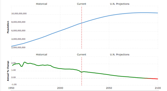 Kvinner får færre barn. Fruktbarheten, antall fødsler per kvinne, har vært fallende i flere tiår. Kvinner har fått økt mulighet til å ta utdannelse og flere kvinner er i arbeid. I tillegg har bruken av prevensjonsmidler økt. I 1950 var det globale fruktbarhetstallet målt til 5 barn per kvinne, mens i 2022 har tallet falt til 2,3 og det forventes å falle videre til 2,1 i 2050.