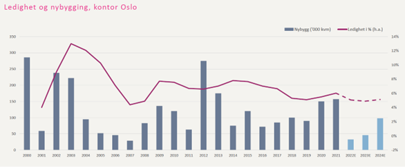 Det er for tiden lav kontorledighet i Norge, særlig i Oslo. Det forventes heller ikke stor økning i antall nybygg de neste tre årene. Det er heller ikke rapportert lavere etterspørsel på grunn av økt bruk av hjemmekontor, men det kan endre seg fremover.