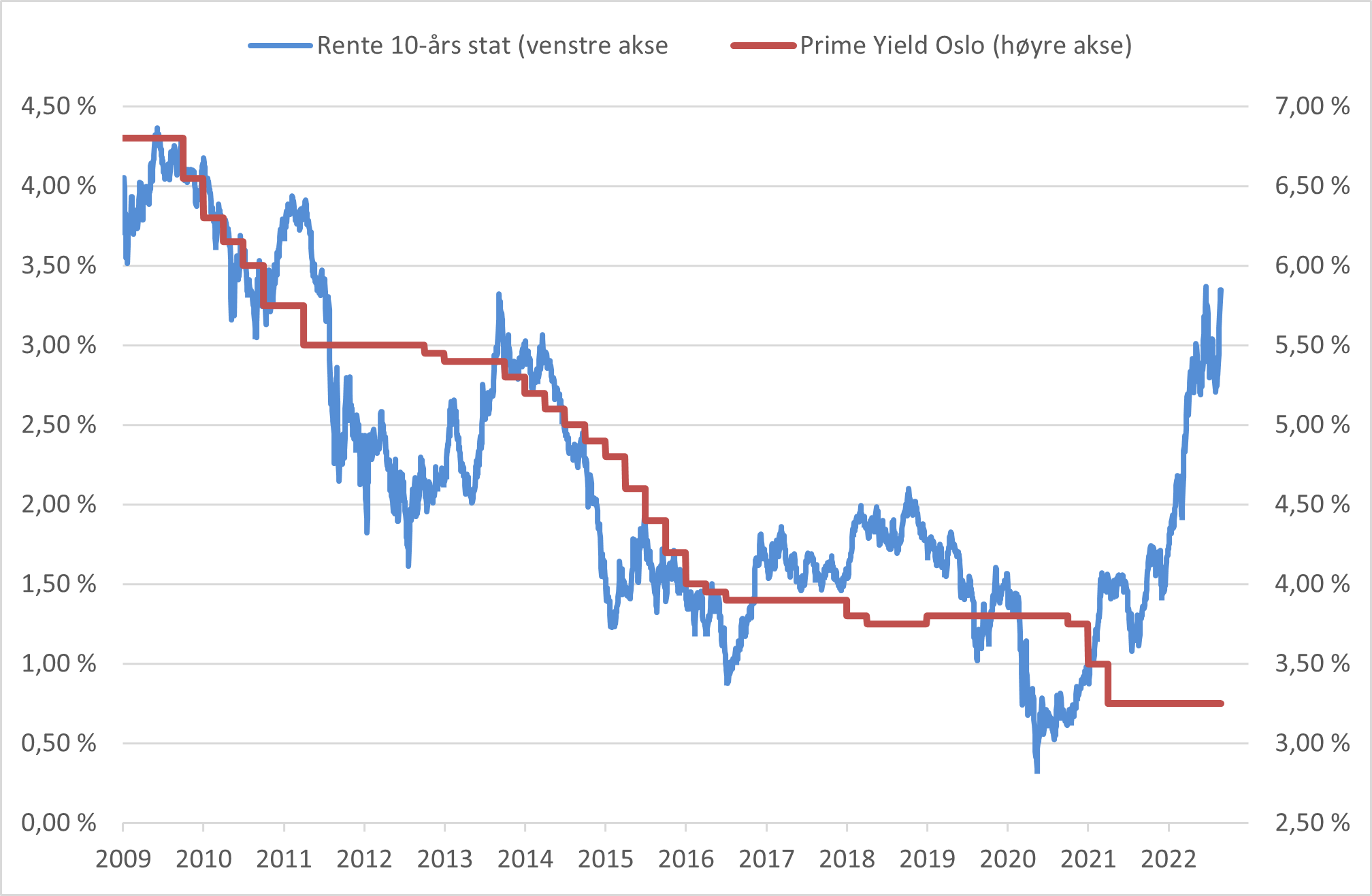 Høy inflasjon, geopolitisk usikkerhet og økende renter har ført til økt usikkerhet i markedet for norsk næringseiendom. Den raske økningen i rentene forventes å ha effekt på avkastningskravet til eiendomsinvestorene. Yield brukes i eiendom som et begrep for avkastning fra leieinntekt på en eiendom (leieinntekt/markedsverdi). Selv om det foreløpig er få eksempler på at yielden faktisk har steget, rapporterer flere og flere aktører om et stemningsskifte i markedet.