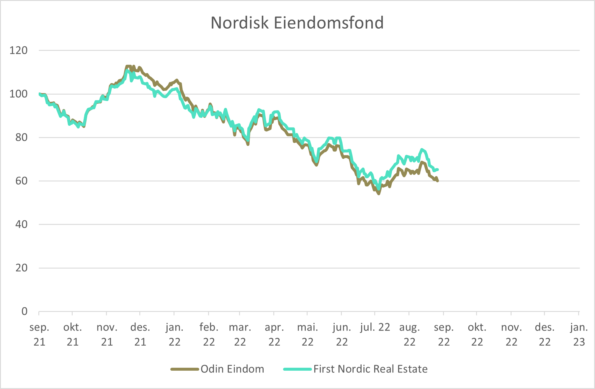 Fond som investerer i børsnoterte eiendomsaksjer i Norden har hatt en svak utvikling den siste tiden. Odin Eiendom og First Nordic Real Estate Fund har falt med henholdsvis 40% og 35% siste 12 måneder. Disse fondene har i hovedsak eksponering mot svenske børsnoterte eiendomsaksjer (Odin Eiendom har 92% og First Nordic Real Estate har 70% svenske eiendomsaksjer). Mange av de svenske børsnoterte eiendomsselskapene er høyt belånt og har falt på grunn av økte renter. Bortsett fra logistikk, prises svenske eiendomsaksjer til en rabatt til verdier. Men også norske eiendomsselskaper har hatt negativ utvikling siste året. Entra er et norsk eiendomsselskap med over 50% av leieinntektene fra offentlige selskaper og har lån som tilsvarer 49% av eiendomsverdiene («loan-to-value»). Aksjen er ned 36% siste 12 månedene.