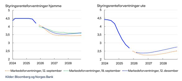 Figur 2 – markedets forventninger til styringsrenten i Norge (hjemme) og våre viktigste handelspartnere (ute)