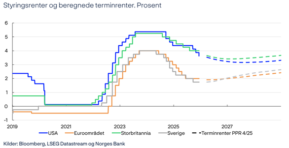 | Noe svakere vekst i global økonomi | Tja | International Monetary Fund (IMF) hadde et estimat på vekst I global økonomi på 3,2% i 2025, mens OECD estimerte 3,3%. Fasit ser ut til å bli 3,2%. |