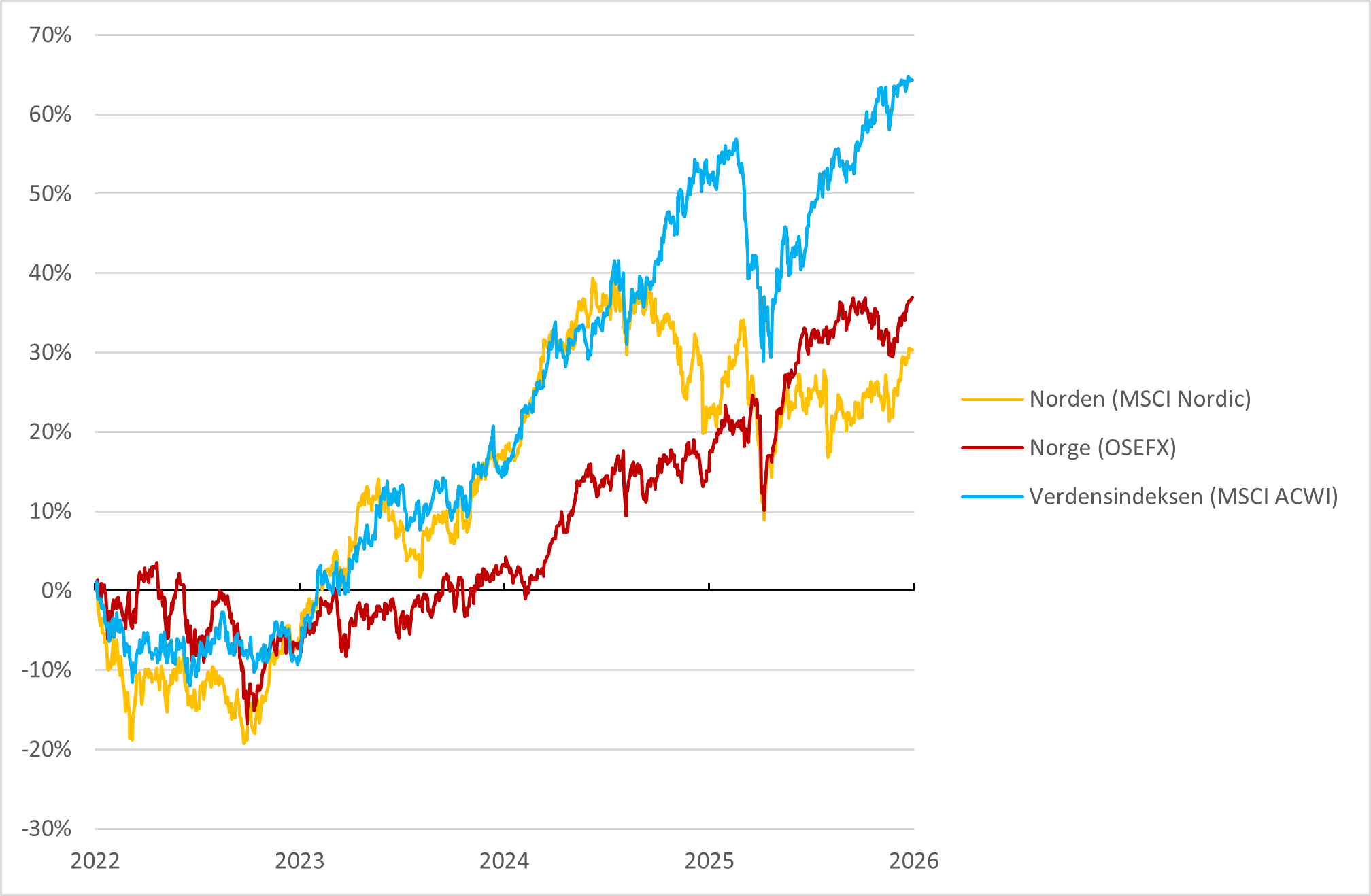 Nordiske aksjemarkeder har den siste tid levert svakere relativ avkastning sammenlignet med globale indekser, til tross for solide selskaper og sterke institusjoner. I 2026 forventer vi at dette gapet gradvis kan begynne å lukkes. Regionen preges av høy eksponering mot industri, energi, sjømat og finans – sektorer som kan dra nytte av både strukturelle trender og mer normaliserte verdsettelser. Samtidig har mange nordiske selskaper sterke balanser og disiplinert kapitalbruk, noe som gir robusthet i et mer volatilt globalt klima. For langsiktige investorer kan nordiske aksjer igjen fremstå som et attraktivt supplement til globale porteføljer. Nordiske aksjer gir en investor god diversifisering, god eksponering mot verdensledende nisjeselskaper, god eksponering mot global økonomi, god eksponering mot land med stabile politiske og økonomiske rammebetingelser, samt god eksponering mot ansvarlige selskaper med god eierstyring. Vi tror nordiske aksjer kan gjøre det bedre enn det generelle aksjemarkedet i 2026.