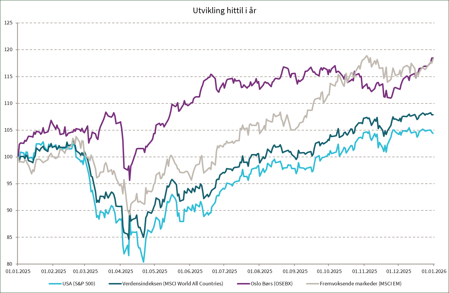 | Amerikanske aksjer er høyt priset og kan utvikle seg svakere enn andre markeder i 2025 | Ja | Det amerikanske markedet endte i 2025 opp 4%, noe som er betydelig svakere enn Norge (+20%), EM (+18%) og Europa (+21%). Målt i US dollar er forskjellene noe mindre, men fortsatt er utviklingen i det amerikanske markedet svakere enn Norge, Europa og EM. |