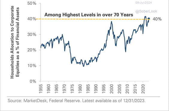 Flere og flere har fått øynene opp for aksjer og plassert en større del av sin sparing i aksjemarkedet. Amerikanerne har 40% av sine finansielle eiendeler i aksjemarkedet og dette er det høyeste nivået på 70 år.