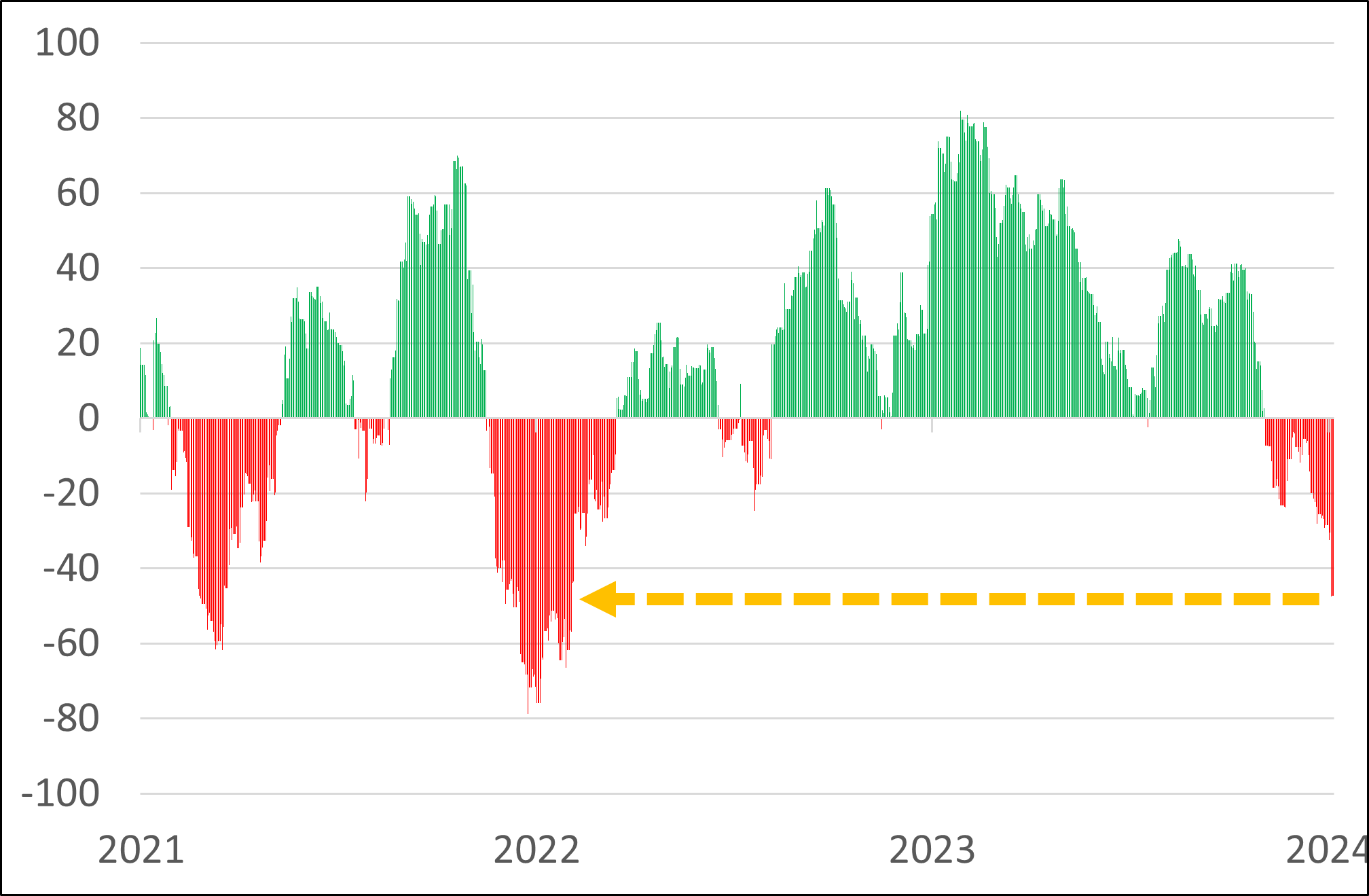 Citigroup lager en «surprise»-indeks som måler forskjellen mellom faktiske økonomiske data og konsensusforventningene fra økonomer. En positiv verdi indikerer at økonomiske data har kommet inn bedre enn forventet, mens en negativ verdi indikerer at dataene har vært svakere enn forventet. Slike indekser gir en indikasjon på den generelle helsen til økonomien og markedsstemningen. Etter over et år med overraskende bra makrotall for amerikansk økonomi, har stemningen forverret seg de siste ukene og indeksen har ikke vært lavere siden juli 2022.