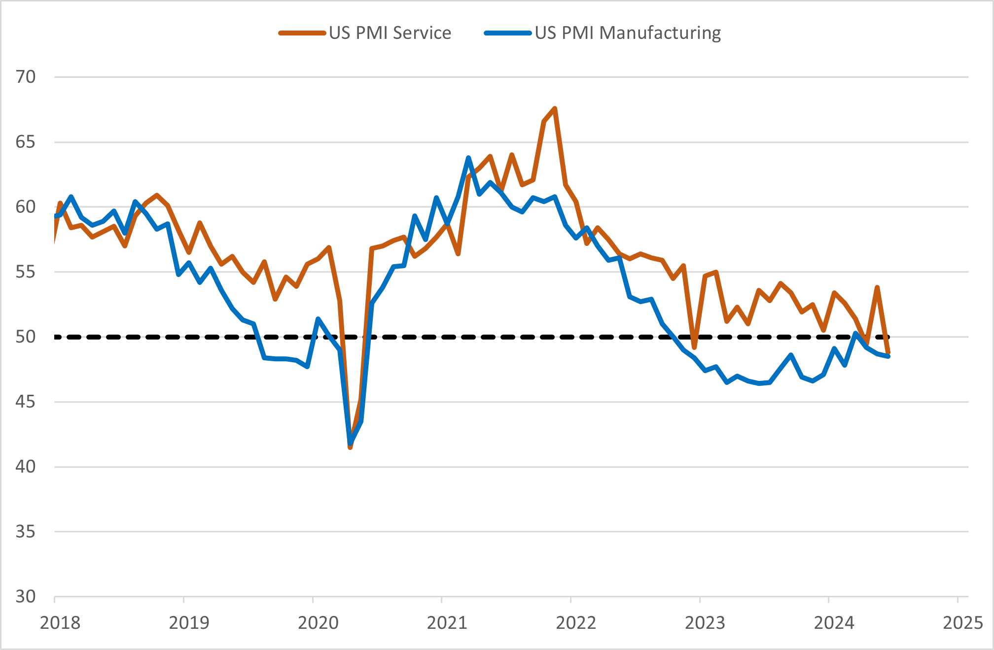 PMI-tallene for industrien har vært under 50-grensen siden oktober 2022, mens tjenestesektoren har holdt seg over i en lengre periode. Bortsett fra siste måling for juni, hvor indeksen for tjenestesektoren falt fra 53,8 til 48,8.