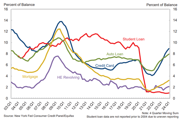 Federal Reserve Bank of New York publiserte en rapport I mai 2024 som viser at 8,9% av kredittkortgjeld og 7,9% av billån er i en form for mislighold (mer enn 30-dagers forsinket betaling). Under finanskrisen var disse tallene 14% og 11% for henholdsvis kredittkortgjeld og billån. Kredittkort- og billån har som oftest flytende rente og derfor merkes renteøkning raskere på denne type gjeld. Men 70% av amerikanernes gjeld er boliglån og der er misligholdsraten kun litt over 3%. Boliglån i USA har som oftest fastrente og selv om dagens boliglånsrente er over 7%, betaler de fleste amerikanerne en rente på boliglånet sitt på under 4%. Det tar derfor lengre tid i USA før en renteøkning bremser økonomien, men likevel er det bekymringsfullt å se at misligholdsraten øker på kredittkort- og billån.