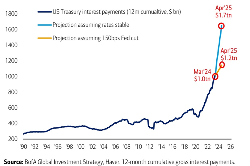 Den amerikanske statsgjelden har økt betydelig de siste årene. USA bruker mer penger enn den henter inn, spesielt på militære utgifter og helseprogrammene Medicare og Medicaid. Skattelettelsene som ble innført under Bush- og Trump-administrasjonene, har også redusert inntektene. Dette har ført til store underskudd på budsjettene. I tillegg har krisepakker og økonomiske stimuleringsprogrammer under finanskrisen i 2008 og Covid 19-pandemien økt gjelden dramatisk. Kraftig renteøkning øker kostnaden for betjening av amerikansk statsgjeld. Med dagens rentenivå, vil den årlige rentekostnaden for amerikansk statsgjeld risikere å øke til 1 700 milliarder dollar i april 2025 ifølge Bank of America. Til sammenligning er oljefondet på 1 600 milliarder dollar. I løpet av de syv første månedene av 2024 var rentekostnadene 514 milliarder dollar og gikk dermed forbi utgiftene til militæret (498 milliarder dollar), Medicare (465 milliarder dollar) og Medicaid (355 milliarder dollar).