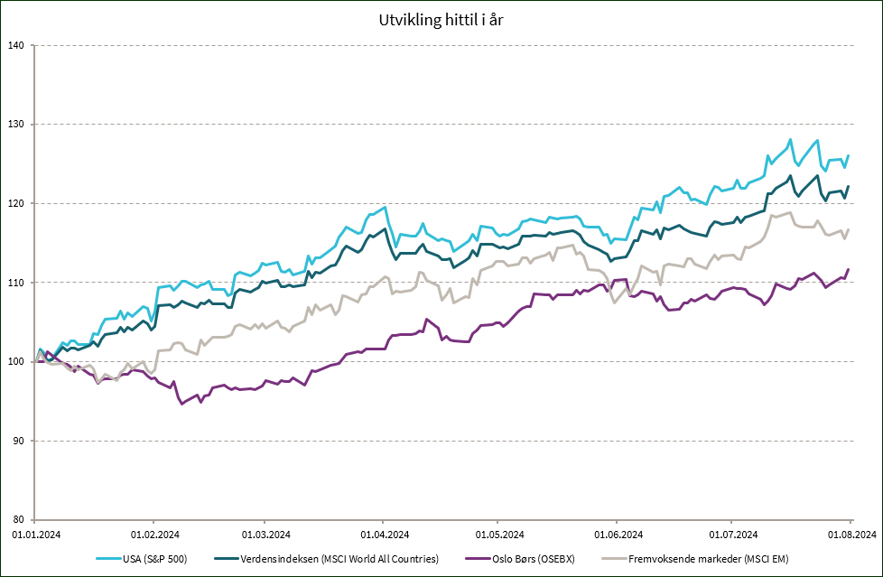 Amerikansk økonomi har hatt solid vekst de siste to årene, til tross for en betydelig økning i sentralbankens styringsrente. Økonomisk vekst har blitt drevet av økt forbruk i tjenestesektoren, lav arbeidsledighet og solid lønnsvekst. Imidlertid har nyere makrotall vist tegn på svekkelse, inkludert en økning i arbeidsledigheten og PMI-indekser som peker mot kontraksjon. Økende mislighold på kredittkort- og billån, sammen med høy statsgjeld og stigende rentekostnader, er bekymringsfulle faktorer. Samtidig har aksjemarkedet, ledet av store teknologiselskaper, nådd rekordhøyder, delvis drevet av økt interesse for kunstig intelligens. Men den økende statsgjelden vil på et tidspunkt bli et problem og må ifølge sentralbanksjef Jay Powell adresseres «sooner rather than later» (FT 2. juli 2024). Det blir spennende å se etter valget i november hvorvidt det er politisk ønske og evne til å gjøre noe med det.